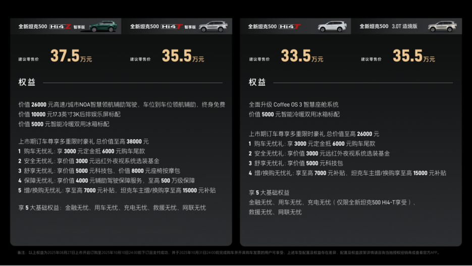 8月27日,全新坦克500在都江堰正式上市发布,仅用2小时就实现大定突破12000台的佳绩。在竞争日益激烈的汽车市场中,全新坦克500用实力向人们证明:价值永远比价格更重要。此次上市的全新坦克500目前共推出四个版本:Hi4-Z智享版37.5万元,Hi4-T智享版35.5万元,Hi4-T基础版33.5万元,3.0T造境版35.5万元。