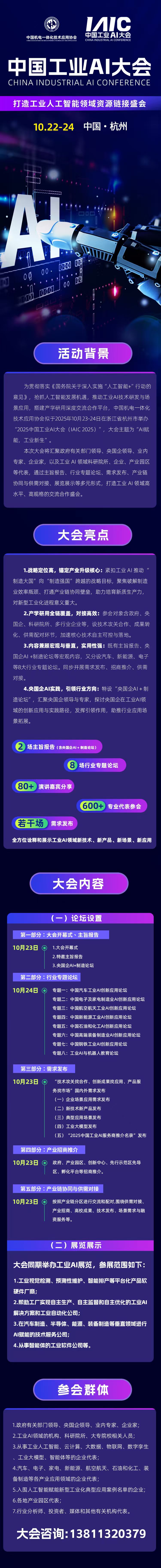 在新一轮科技革命与产业变革深度演进的背景下,人工智能已成为驱动产业升级、赋能经济社会高质量发展的核心力量。为贯彻落实国务院《关于深入实施 “人工智能 +” 行动的意见》中 “推进工业全要素智能化发展,加快人工智能在设计、中试、生产、服务、运营全环节落地应用” 的部署要求,响应工业和信息化部关于研究出台 “人工智能 + 制造” 专项行动实施方案、推进重点行业智能化转型的工作安排,中国机电一体化技术应用协会定于今年10月23日-24日在浙江杭州举办 “2025 中国工业AI大会(IAIC 2025)”。