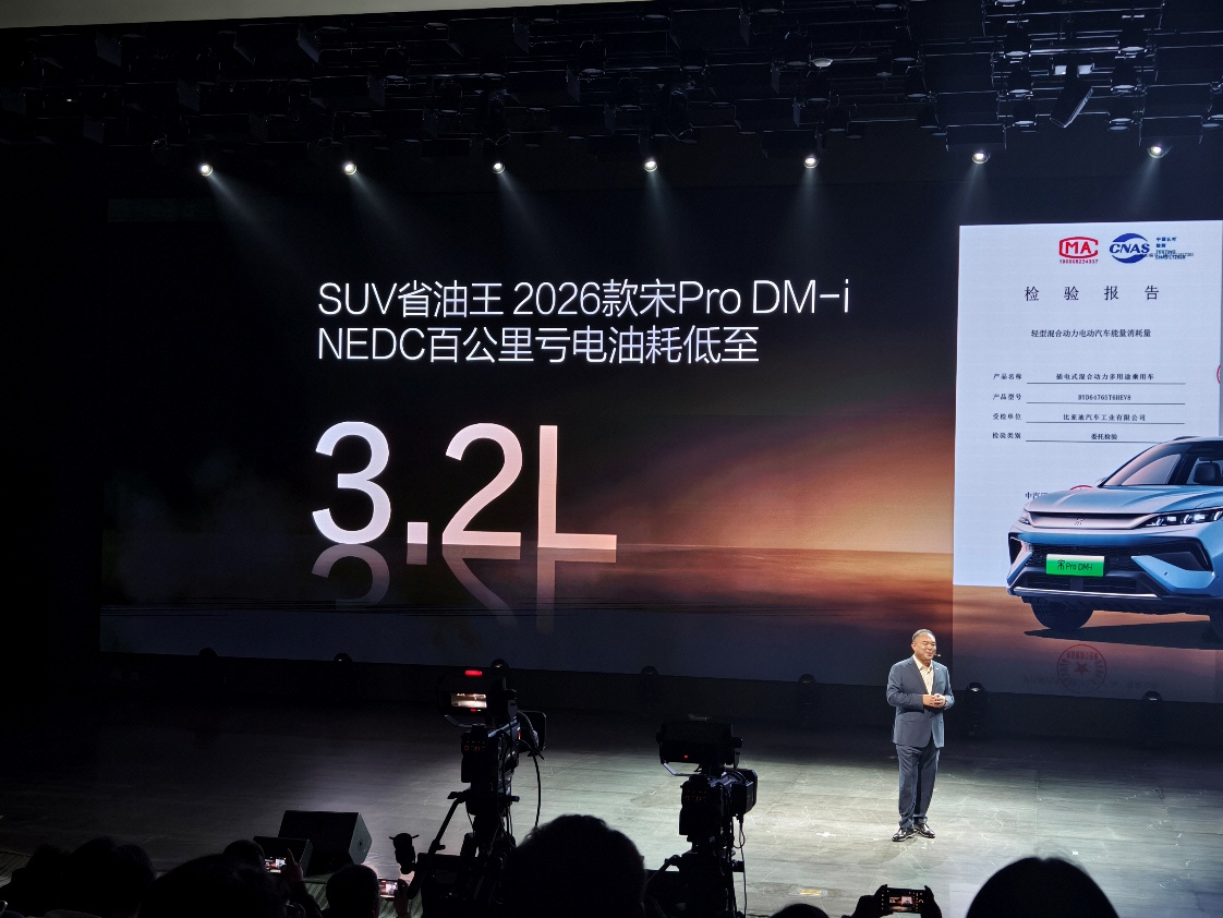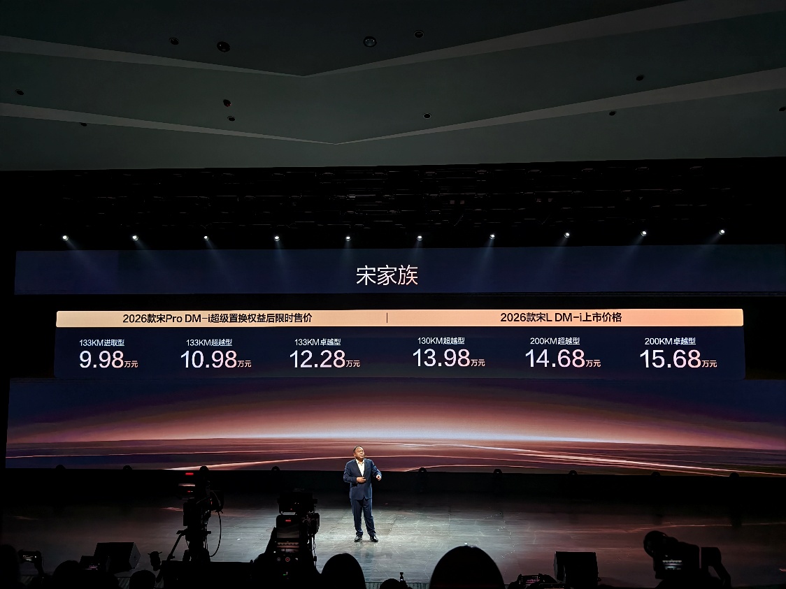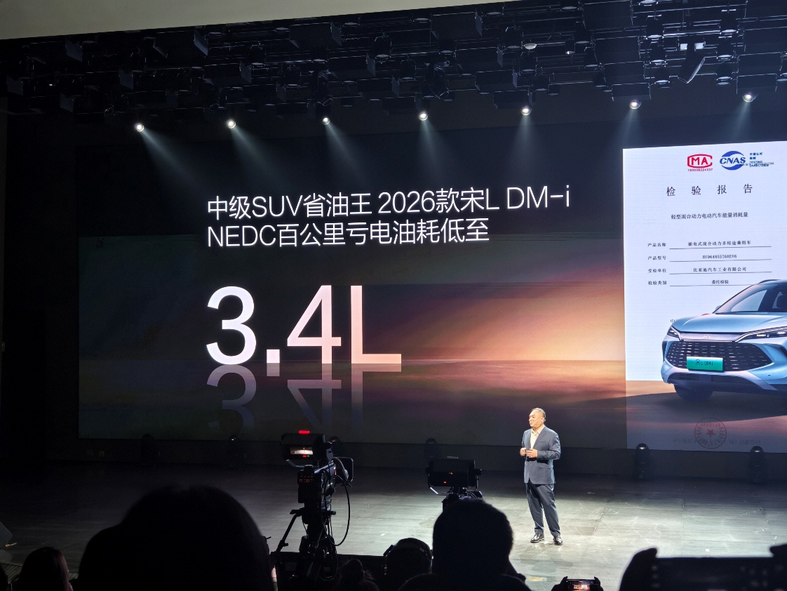 其中,2026款宋Pro DM-i百公里亏电油耗低至3.2升,纯电续航提升至133km,而这也创下了全球最低纪录。而2026款宋L DM-i纯电续航高达200km,百公里亏电油耗低至3.4升。