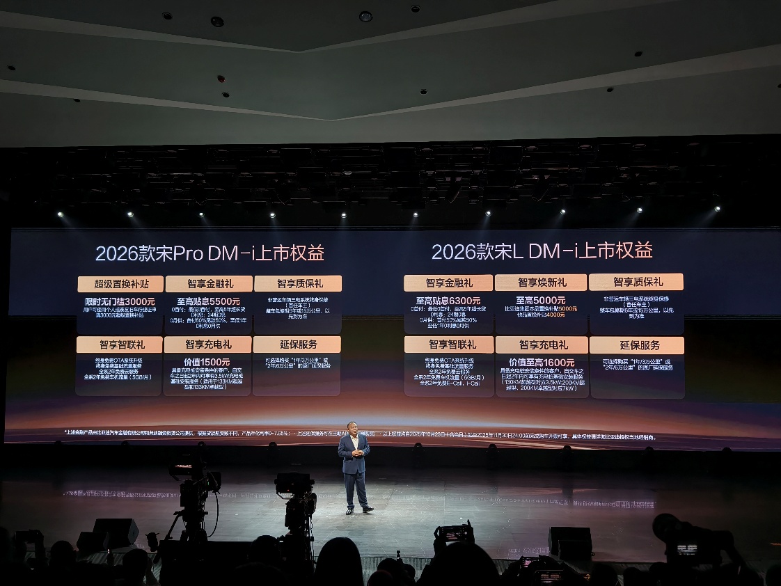 10月23日,2026款比亚迪宋L DM-i、宋Pro DM-i正式上市,其中宋L DM-i推出了3款车型,售价区间13.98-15.68万元;2026款宋Pro DM-i贴心的推出超级置换福利政策,在11月30日之前完成下单的消费者,将能获得3000元的置换补贴,限时售价仅9.98-12.28万元区间,如此亲民的价格,无疑为那些既追求车辆品质又注重实惠的年轻家庭,提供了一个极具吸引力的购车选项。同时,两款车型还提供了丰厚的上市权益。