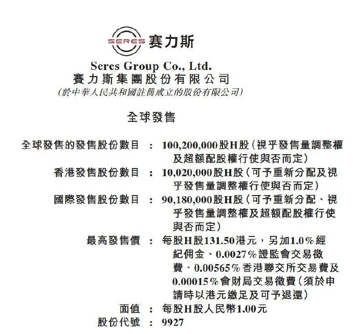 【EV视界报道】10 月 27 日,赛力斯启动港股招股,招股期至 10 月 31 日,计划 11 月 5 日以 “9927” 为代码登陆港交所。