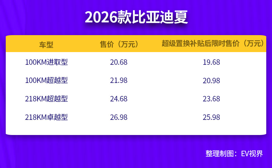 相比现款车型,2026款比亚迪夏的定价保持稳定,而1万元置换补贴直接将入门价拉至19.68万元。
