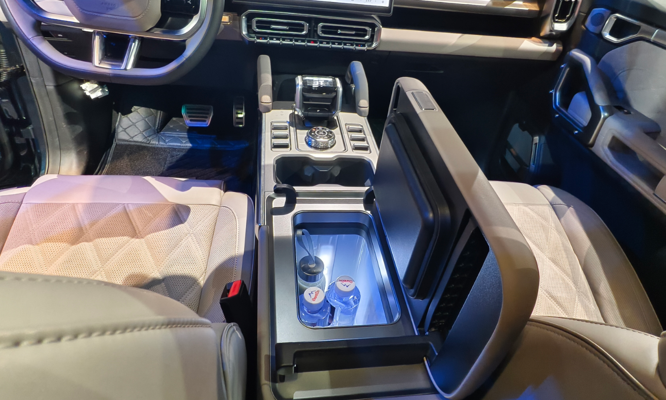 细节配置上,中央扶手内置制冷温度5-50℃的6.4L压缩机冰箱,二排小桌板承重达5kg可放置15.6英寸笔记本电脑,香氛系统提供6种香型,配合64色可调氛围灯实现场景联动,进一步提升座舱豪华感。