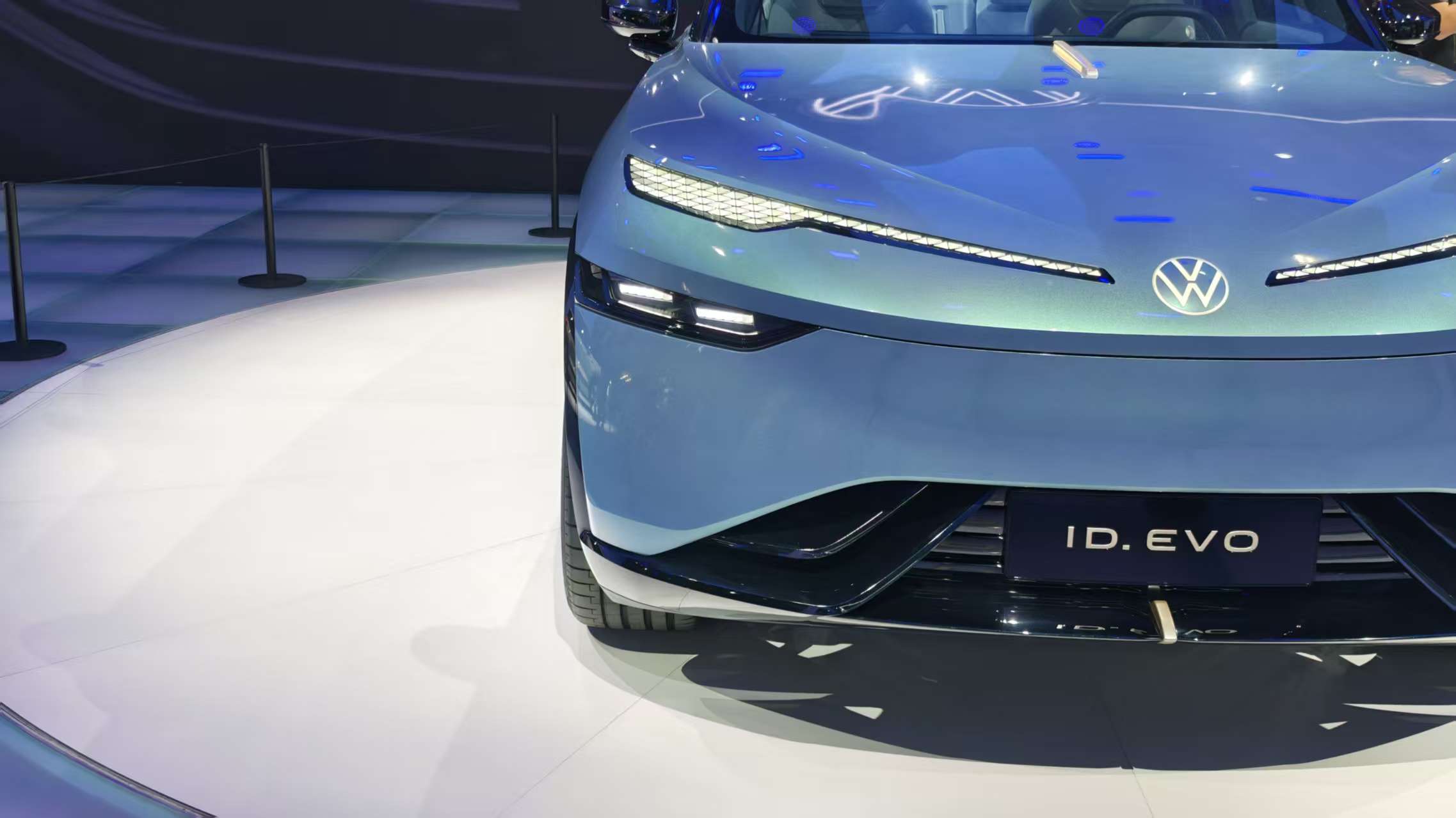 外观上,大众安徽ID.EVO概念车走的是纯电车型常见的封闭式前脸路线,型面干净得没多余线条,简约又大气。前灯组设计特别戳人,细长的造型搭配中央能发光的大众Logo,科技感直接拉满。更有意思的是,两侧灯组是用一堆3D微棱镜拼出来的,能播放各种互动动画——比如开启L4自动驾驶后,会转着蓝色“小眼球”,仪式感直接拉满,还能跟路人互动。