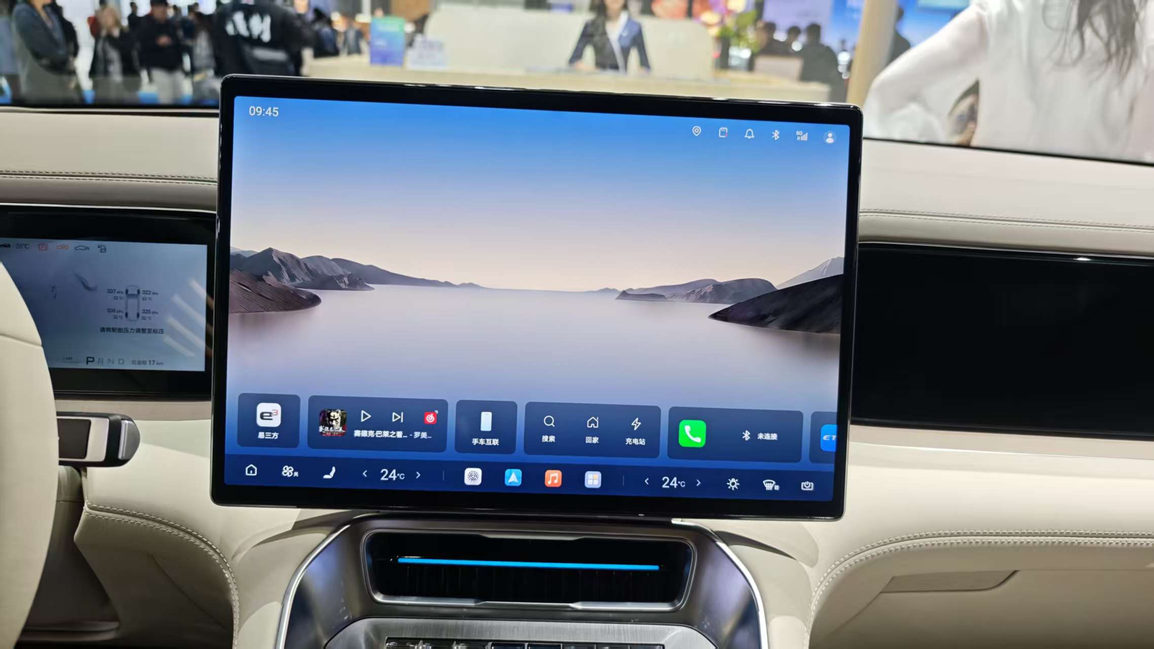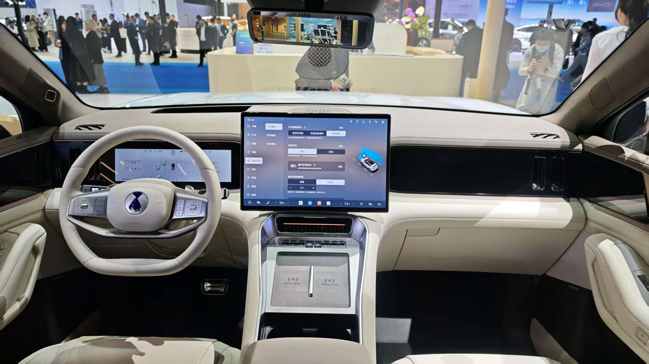 内饰有三种颜色:云锦米、金山棕、铂檀灰,质感看着不错。前排屏幕堆料够狠,50寸AR-HUD+13.2寸仪表屏+17.3寸中控屏+13.2寸副驾拓展屏+9英寸流媒体内后视镜,多屏互联顺畅,全场景智能语音、手车互联这些功能都有,操作起来不费劲。