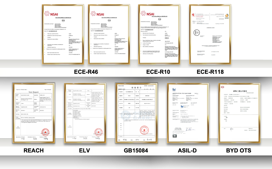 面向全球市场,森鹏电子后视镜不仅全面通过ECE R46、R10、R118、GB15084、REACH、ELV等国内外权威认证,而且成功获得比亚迪OTS工程认可,具备主机厂量产导入资质。