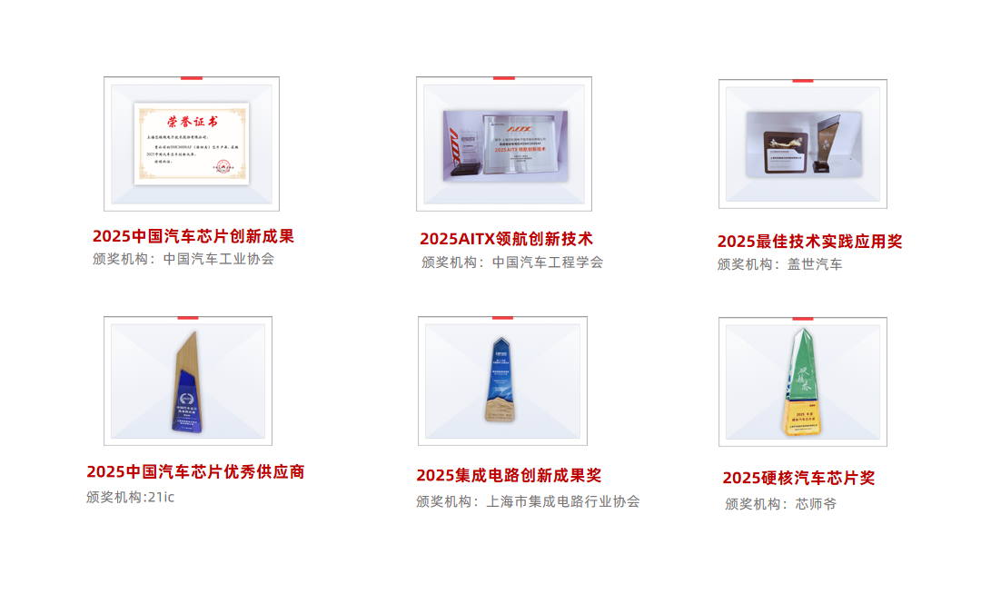 SMC6008AF自量产以来,凭借硬核的创新技术和优异的市场表现,已荣获2025中国汽车芯片创新成果、2025AITX领航创新技术、2025最佳技术实践应用奖、2025集成电路创新成果等多项殊荣,颁奖方来自中国汽车工业协会、中国汽车工程学会、上海市集成电路行业协会等权威机构,评委团成员由整车厂及头部供应商的 CTO、中国汽车工程学会会士、车企领导、权威专家等组成的专家委员会。
