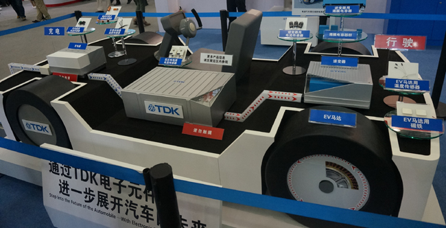 TDK展出了用于混合动力车及电动汽车马达控制的角度传感器。该产品采用了GMR元件。与目前使用线圈和磁铁的主流角度传感器相比,其特点是传感器精度高达0.35度,并且尺寸较小。