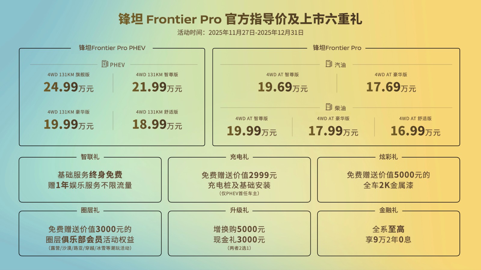 从满足功能需求的皮卡,升维至承载生活想象的潮玩好物;从单一的车型,演进为连接用户与生态的平台;无论是创业路上的可靠伙伴;荒野探索的无畏勇士;还是城市生活的潮流玩伴,都需要一台锋坦Frontier Pro!锋坦Frontier Pro正在以全新姿态,拓展新时代皮卡的想象边界,以一车千面的全能实力,成为用户切换生活模式的万能钥匙。此次锋坦Frontier Pro全球首发上市,不仅是日产深化在华战略布局的关键一步,更是对“在中国、为中国、向全球”承诺的坚定践行。