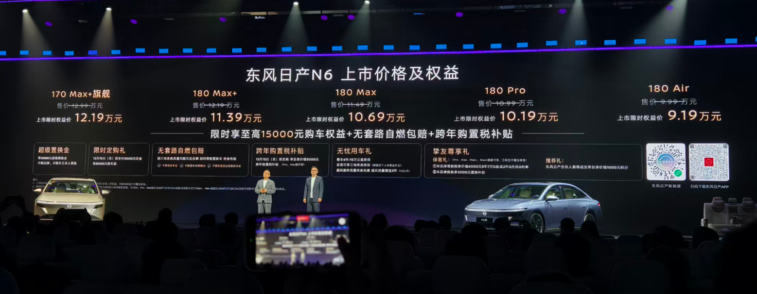 12月1日,东风日产N6意外提前7天官宣上市,这款原定于12月8日亮相的插混轿车,凭借9.19-12.19万元的限时权益价(官方指导价9.99-12.99万元),刚登场就点燃了家用车市场。作为东风日产天演架构下的首款插混车型,它敢顶着高期待提前上市,核心底气正是这套“10万级价格,百万级配置”的产品组合。