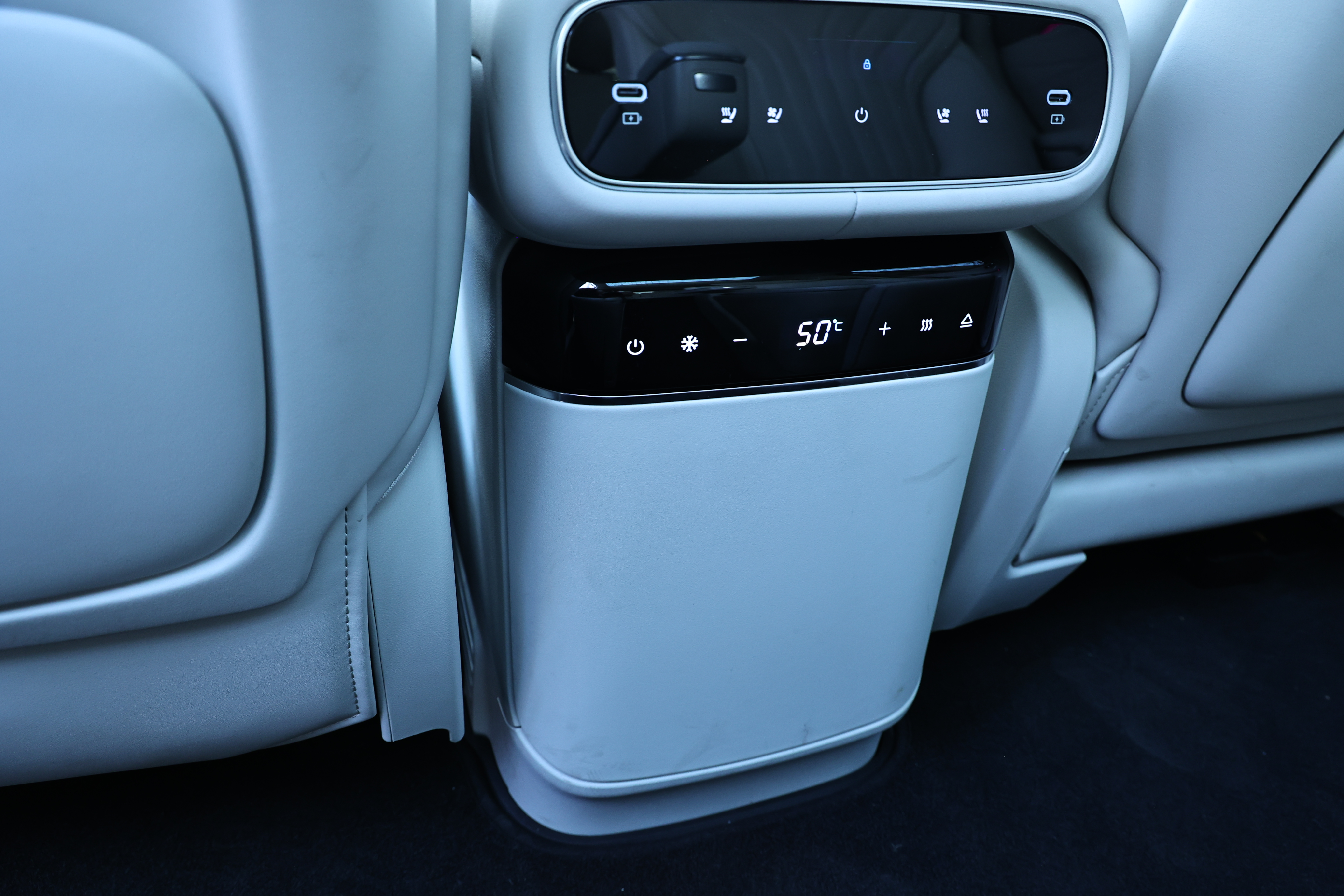 第二排聚焦“带娃专属体验”,独立座椅搭载高清娱乐屏,化解孩子乘车哭闹难题;9.1L智能冷暖冰箱(-6℃~50℃)可保温热牛奶、冷藏水果,隐藏式杯托适配孩子吸管杯,细节拉满带娃便利性。