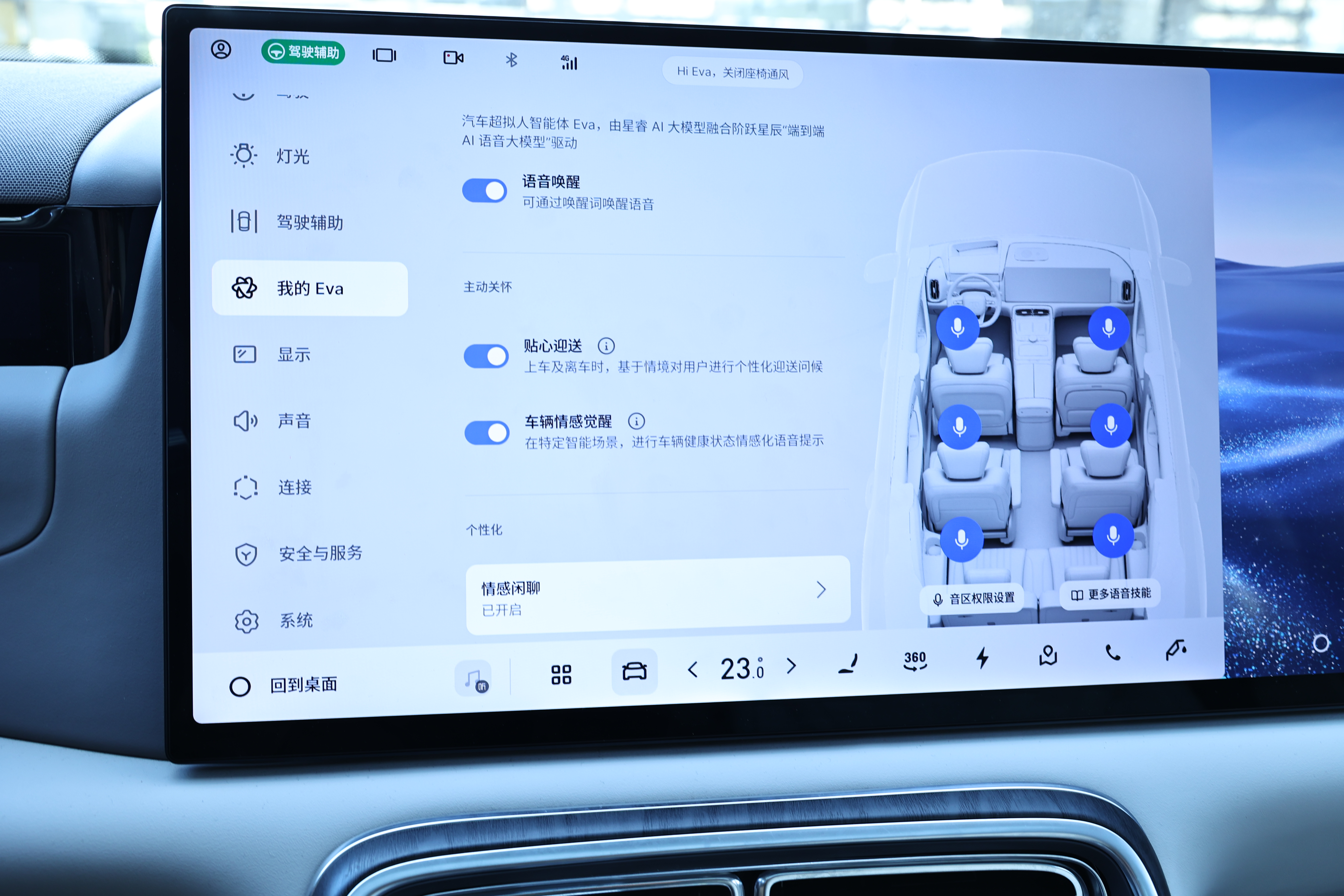 Eva语音助手搭载端到端语音技术,除精准识别指令外,更支持情绪理解、车外嘴替、车外识物等场景化功能,适配单手抱娃缴费、孩子哭闹安抚、停车障碍物识别等家庭高频场景。