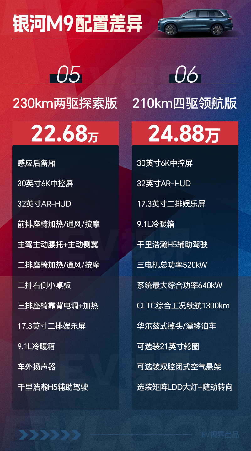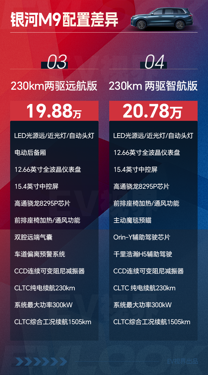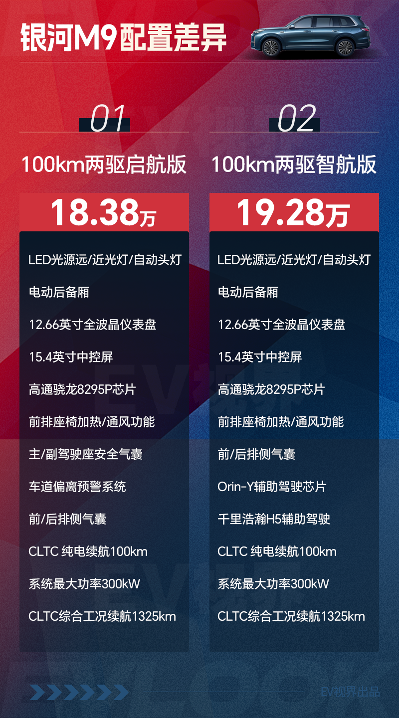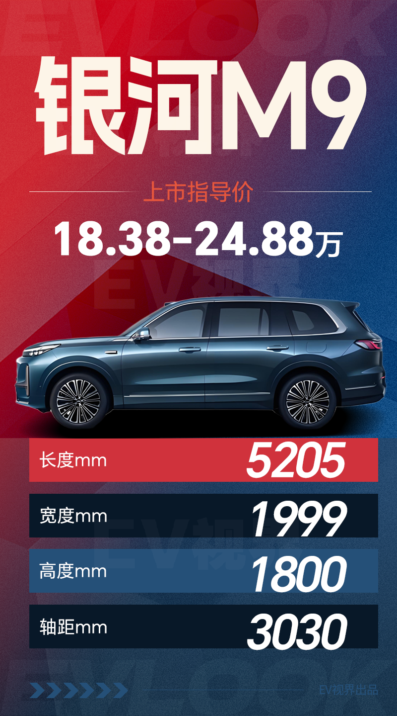 银河M9指导价18.38万-24.88万元,覆盖“基础刚需”到“全面尊享”的全场景需求,6个版本避免功能冗余或核心缺失,精准匹配不同家庭预算与用车场景,