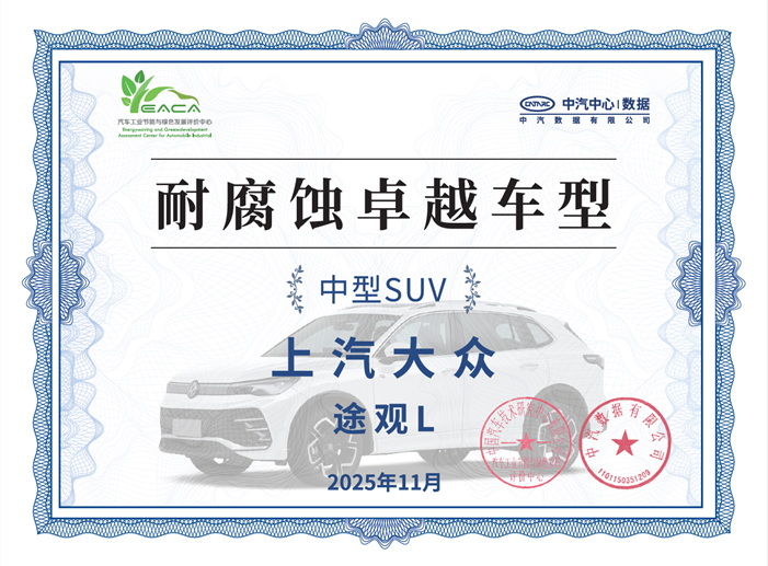 2025年,上汽大众在质量领域堪称“大丰收”。中国汽车质量委员会颁发的“质量进步奖”、途观L获评“2025年耐腐蚀卓越车型”、途昂Pro斩获“中大型SUV车型奖”、ID.3三连冠NEV-CACSI等等,这些奖项不是凭空来的,而是源于贯穿产品全生命周期的严苛标准。