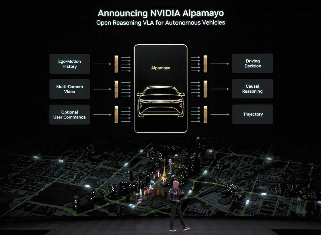 先讲Alpamayo,这是全球第一个开源的视觉-语言-行动推理模型,有10亿参数规模,能同时处理视频和传感器的输入,输出行驶路线的时候还能把“琢磨的过程”说清楚。