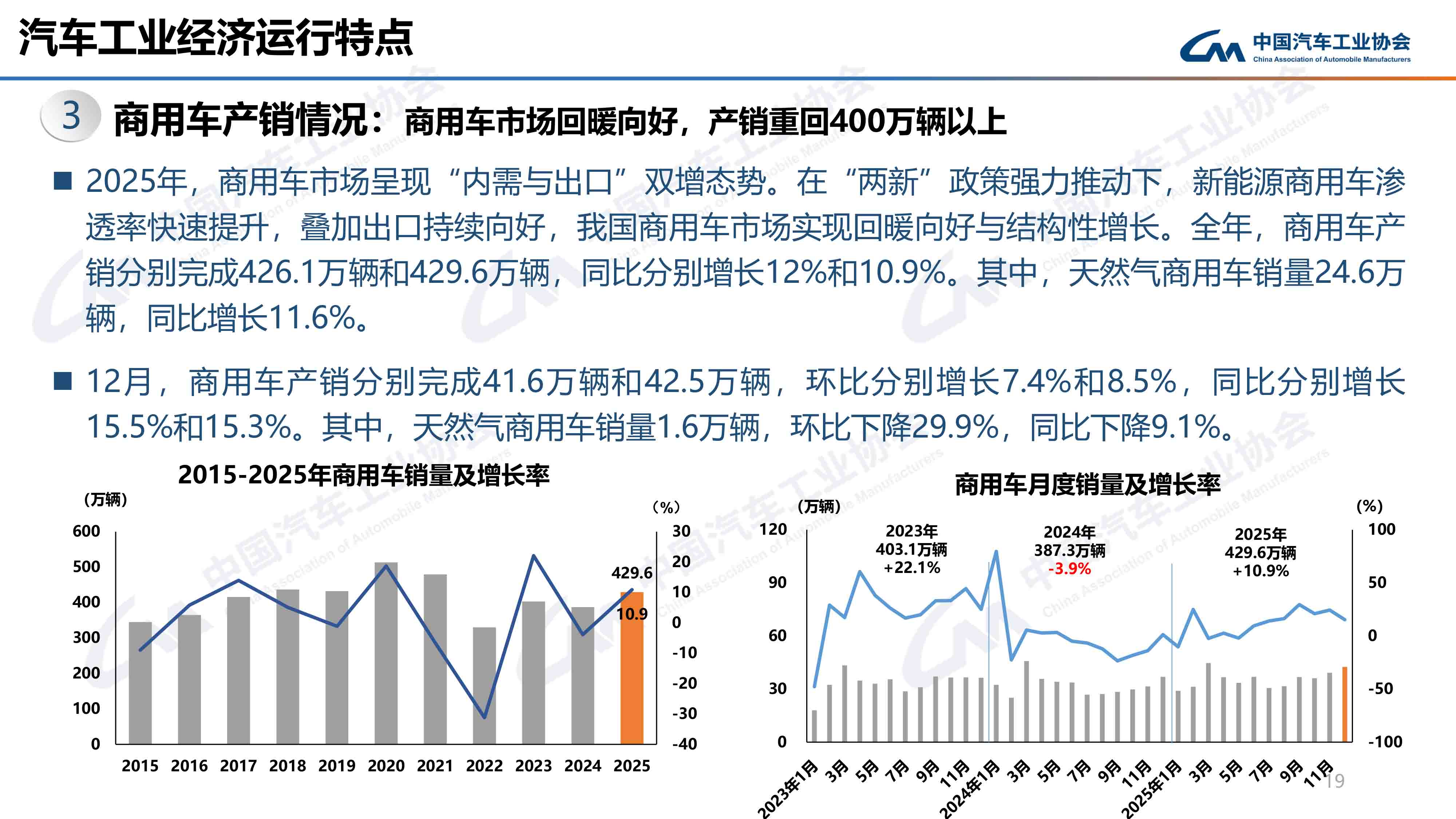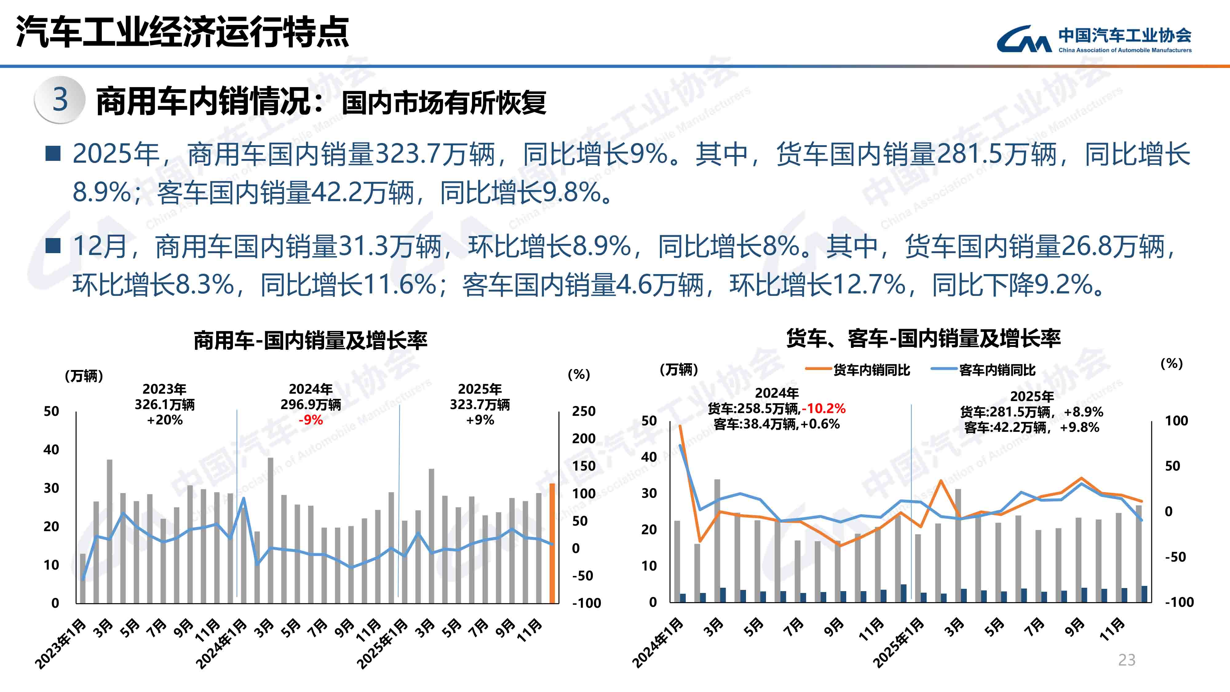 根据中国汽车工业协会发布数据显示,2025年全年,我国商用车产销累计完成426.1万辆和429.6万辆,同比分别增长12%和10.9%,产销回归400万辆以上。在商用车主要品种中,与2024年相比,客车和货车产销均呈实现10%以上增长。2025年全年,我国商用车国内销量323.7万辆,同比增长9%。其中,货车国内销量281.5万辆,同比增长8.9%;客车国内销量42.2万辆,同比增长9.8%。