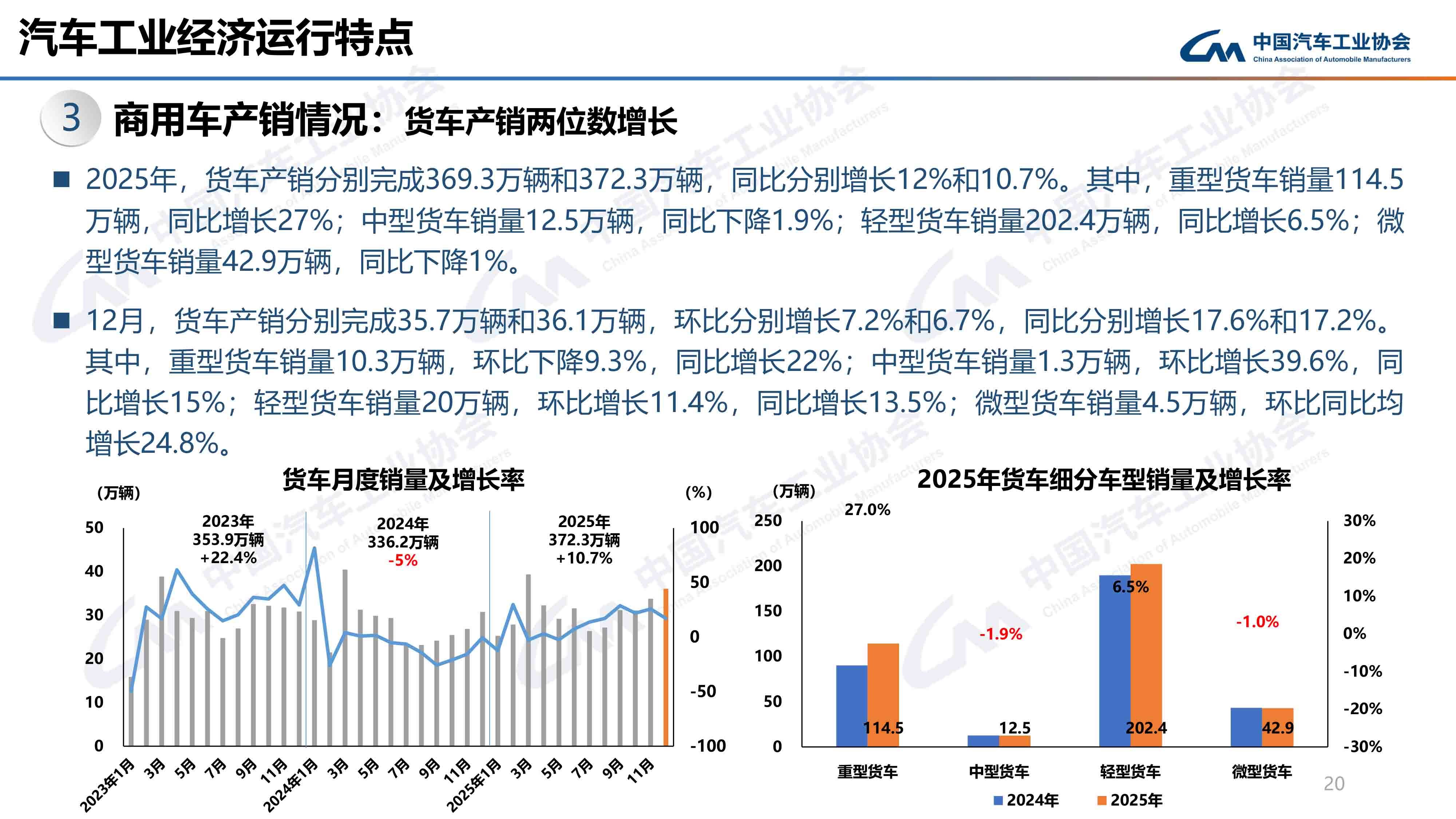 【EV视界综合报道】2026年1月14日,中国汽车工业协会对外发布了商用车2025年12月以及2025年全年的产销最新数据。其中,2025年12月,我国商用车产销分别完成41.6万辆和42.5万辆,环比分别增长7.4%和8.5%,同比分别增长15.5%和15.3%;而2025年全年,商用车产销累计完成426.1万辆和429.6万辆,同比分别增长12%和10.9%,产销再次回归400万辆以上。