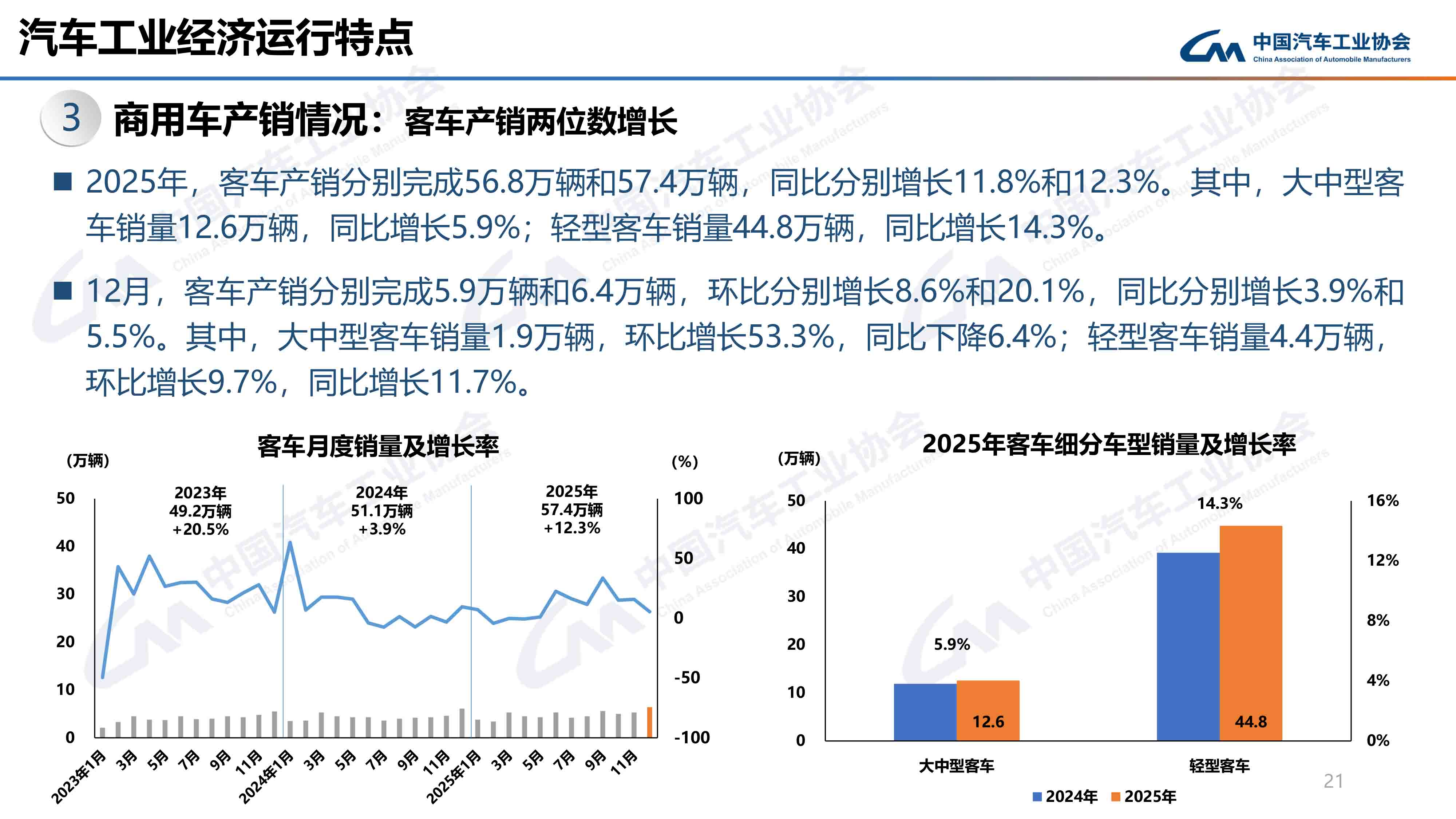 在细分品种中,2025年全年我国货车产销分别完成369.3万辆和372.3万辆,同比分别增长12%和10.7%。其中,重型货车销量114.5万辆,同比增长27%;中型货车销量12.5万辆,同比下降1.9%;轻型货车销量202.4万辆,同比增长6.5%;微型货车销量42.9万辆,同比下降1%;而我国客车产销分别完成56.8万辆和57.4万辆,同比分别增长11.8%和12.3%。其中,大中型客车销量12.6万辆,同比增长5.9%;轻型客车销量44.8万辆,同比增长14.3%。