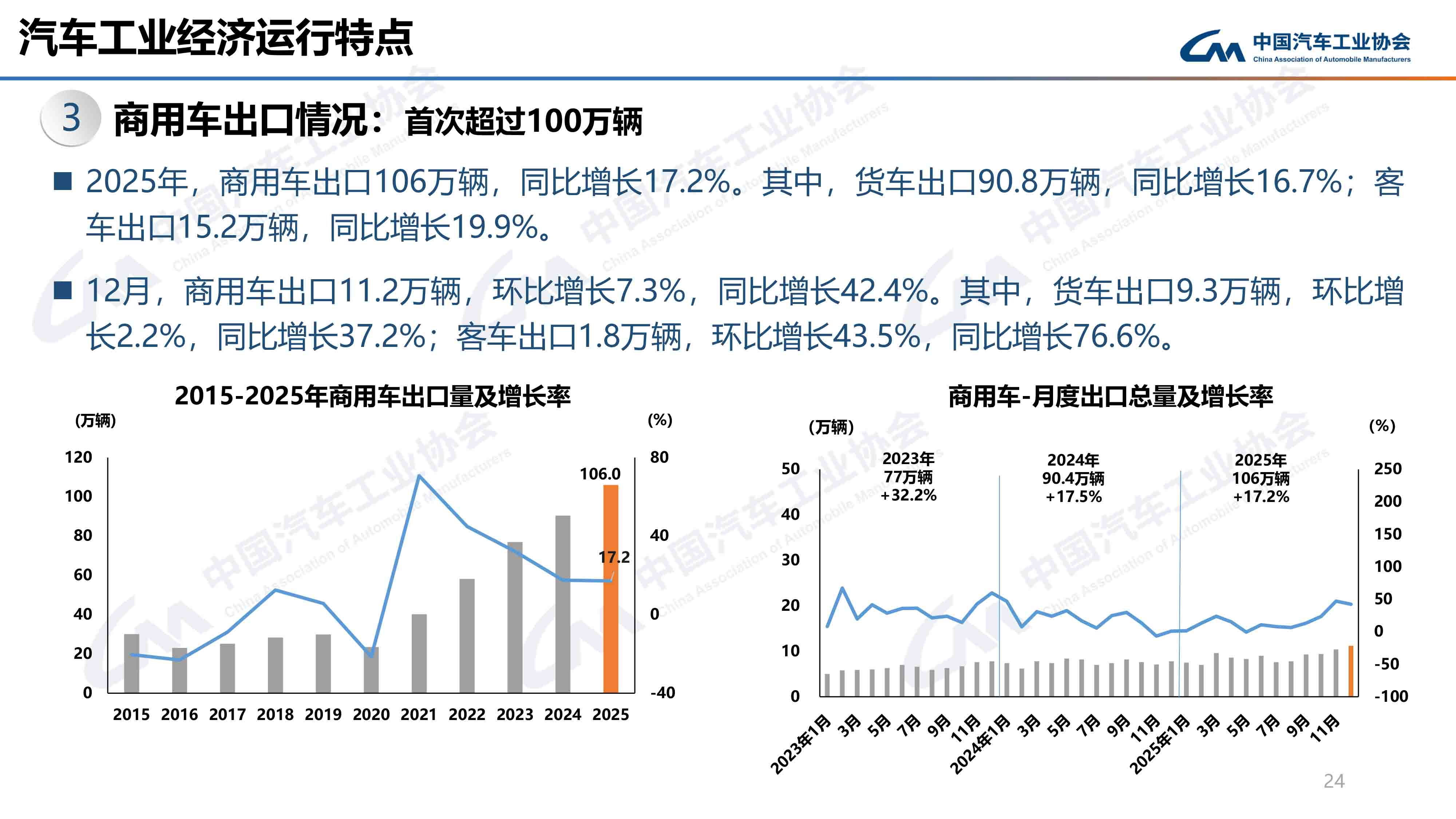 而2025年全年,我国商用车出口106万辆,同比增长17.2%。其中,货车出口90.8万辆,同比增长16.7%;客车出口15.2万辆,同比增长19.9%。