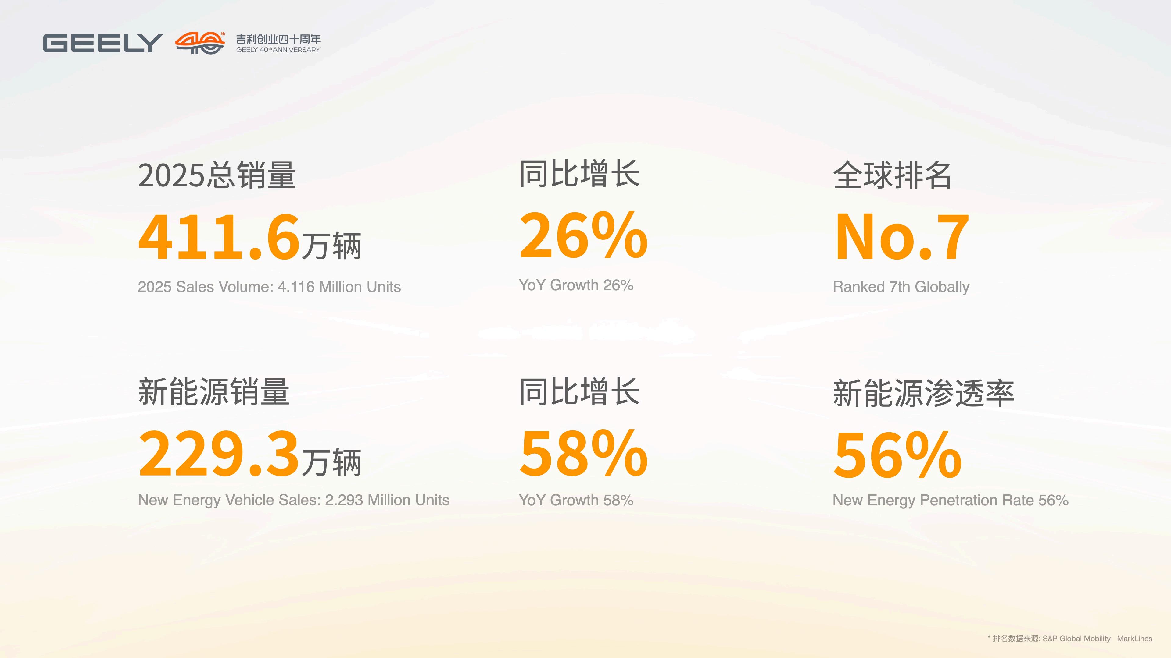 2025年吉利刚交出411.6万辆的成绩单,同比增长26%,新能源销量更是暴涨58%,渗透率冲到56%,全球排名第七且是前十里增速最快的。势头正猛的时候,不趁机多铺几条产品线,反而要收缩战线“合拳”?这到底是战略清醒,还是另一种形式的保守?