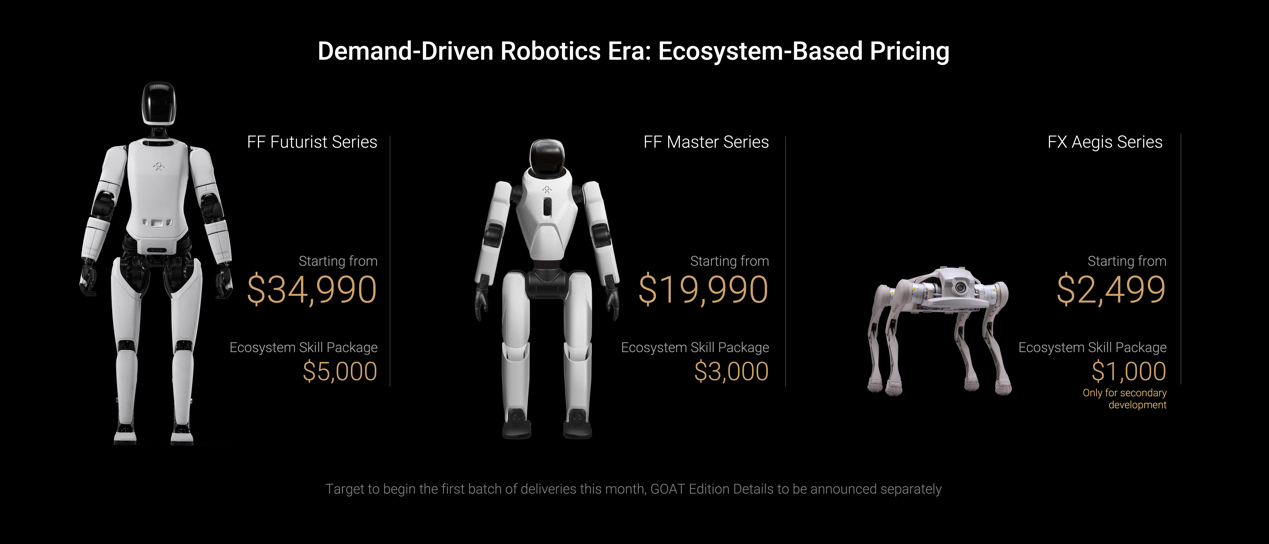 FF EAI机器人独创“终端+生态技能包”全新生态价格体系:Futurist系列终端起售价为$34,990,生态技能包价格为$5,000;FF Master系列起售价为$19,990,生态技能包价格$3,000;FX Aegis系列起售价为$2,499,生态服务包价格$1,000。这一杀手级价格,将加速EAI机器人普及,推动其从概念走向规模化、刚需化的实际应用时代。