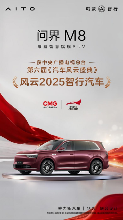 近日,由中央广播电视总台主办、总台财经节目中心特别策划的第六届《汽车风云盛典》圆满落幕。“家庭智慧旗舰SUV”问界M8亮相盛典,荣获“风云2025智行汽车”荣誉称号,凭借在智能汽车领域展现出的硬核实力,赢得行业权威与市场消费者的双重认可。