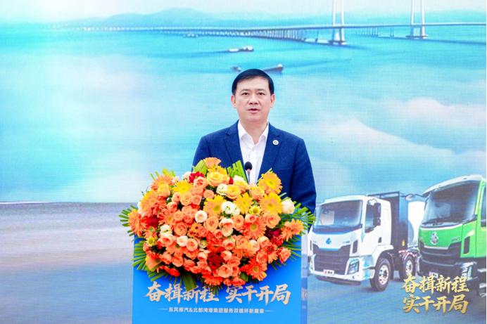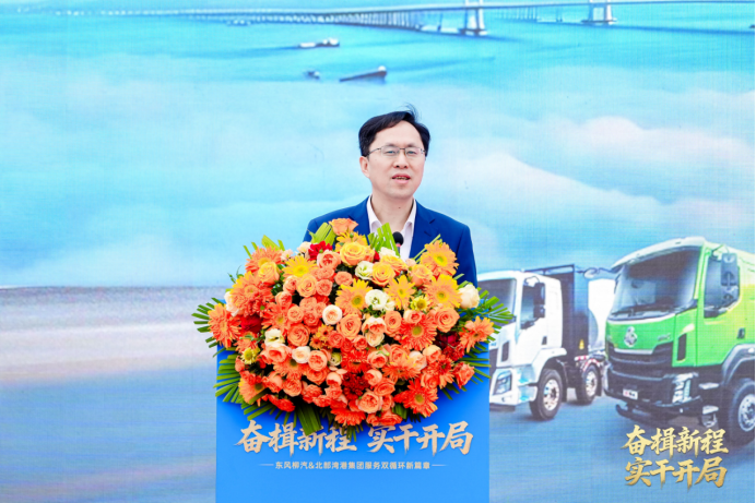 随后中国物流与采购联合会副会长杨国栋,广西北部湾国际港务集团有限公司党委书记、董事长胡华平,东风柳州汽车有限公司总经理林长波等领导共同登台,为活动启动揭幕,并分别发表讲话。杨国栋指出:“东风柳汽与北部湾港集团协同发力,是产业链深度融合的典范,更是服务国家战略、推动交通强国建设的生动实践”;胡华平表示,北部湾港集团将主动服务国家战略,持续优化“新三样”运输服务体系,为“广西制造”扬帆出海搭建便捷平台;林长波则强调:“左手是制造,右手是物流,中间连接的是千千万万的奋斗者”。讲话立足发展实际,既擘画了双方战略合作的发展蓝图,也为深化产港融合、服务双循环新发展格局凝聚了强大共识与奋进力量。