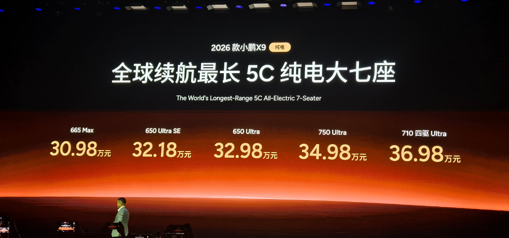 先跟大家聊最实在的价格和车型,2026款小鹏X9纯电版一口气推出5款车型,售价从30.98万到36.98万,从入门的665 Max到顶配的710四驱Ultra,覆盖了不同家庭的购车需求,同时官方还顺带公布了增程版新增车型1602 Ultra SE,32.18万的定价直接把纯电、增程的选择都摆到了用户面前,不用再纠结动力形式的价格壁垒。