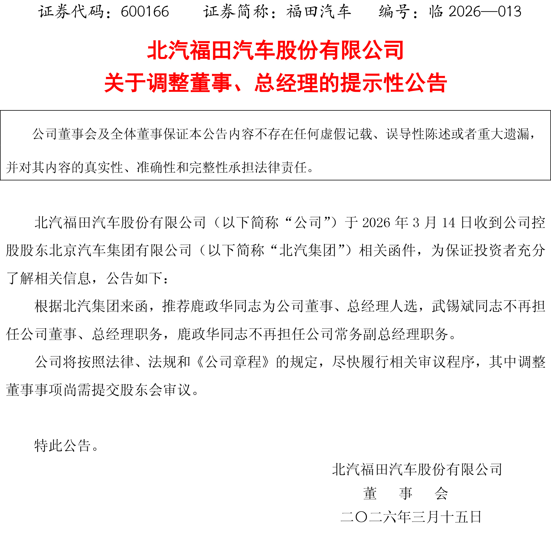 在此次发布的公告中表示:“北汽福田汽车股份有限公司(以下简称“公司”)于2026年3月14日收到公司控股股东北京汽车集团有限公司(以下简称“北汽集团”)相关函件,推荐鹿政华同志为公司董事、总经理人选,武锡斌同志不再担任公司董事、总经理职务,鹿政华同志不再担任公司常务副总经理职务。”