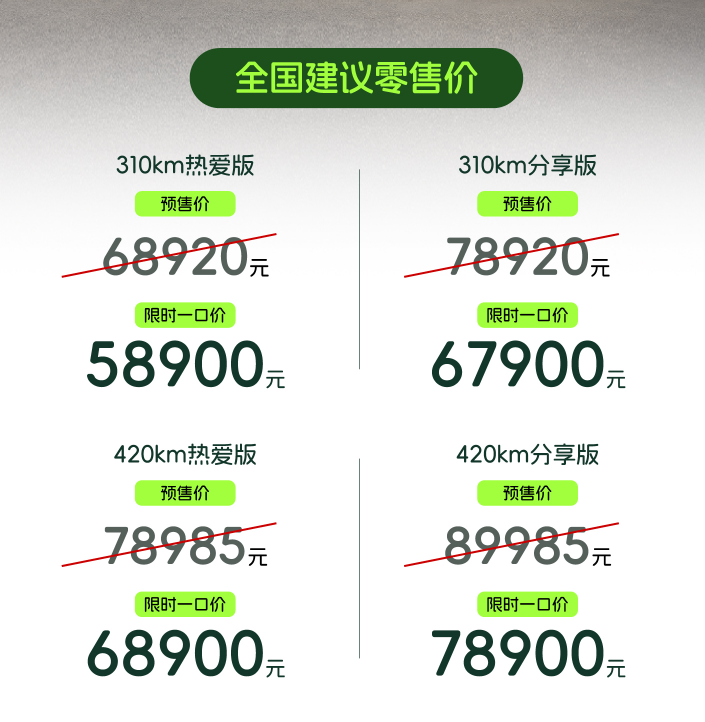 电池采用单电芯独立防爆阀设计,通过中汽中心六维电安全认证,官方承诺“电池0自燃”,进一步提升用户使用信心。续航方面提供CLTC 310km和420km两个版本,310km版本适配日常通勤、买菜接娃,一周一充即可满足需求;420km版本可覆盖周末跨城、周边游,有效缓解续航焦虑。