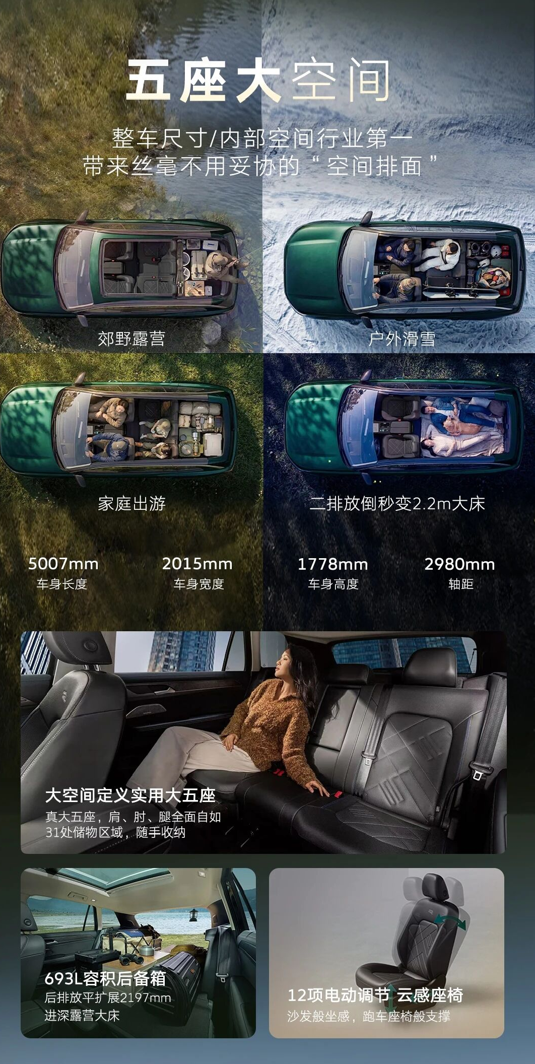 对于中大型SUV来说,空间是核心竞争力,但很多车型要么盲目追求车长,内部空间却被浪费;要么搞个7座布局,第三排形同虚设,第二排空间也被压缩。不知道大家有没有过这种体验:买了一台号称“大空间”的SUV,结果后排坐三个人挤得慌,后备箱放个儿童车加行李箱就满了,所谓的“大空间”,全是噱头。