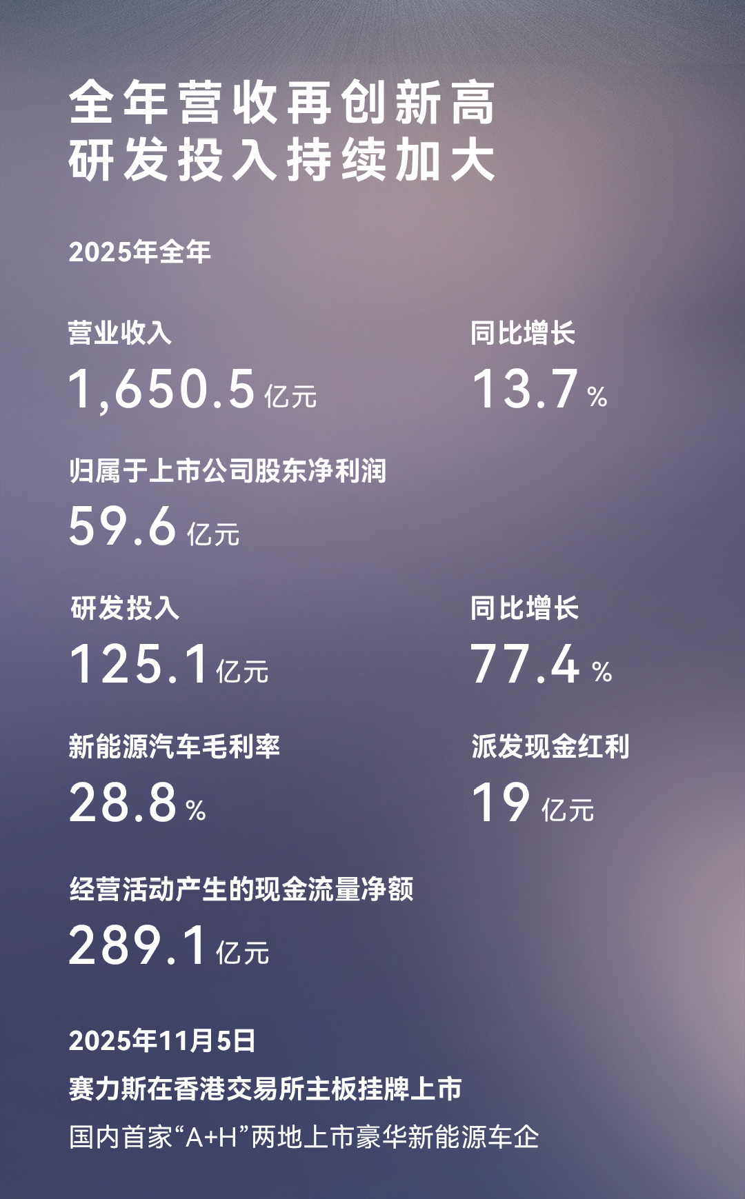 先看最核心的财务数据。2025年赛力斯全年营业收入1650.5亿元,同比增长13.7%,创下历史新高。归母净利润59.6亿元,连续两年保持盈利。在行业普遍薄利甚至亏损的阶段,赛力斯不仅稳住盈利,还实现利润规模稳步提升,这本身就是一种稀缺能力。