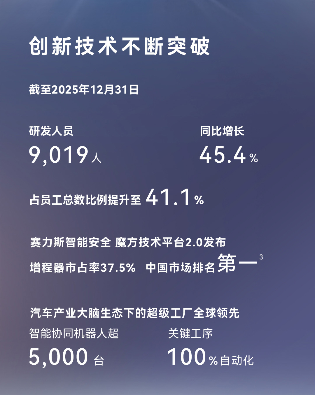 研发投入的增长,不是盲目扩张,而是精准聚焦。赛力斯坚定软件定义汽车路线,围绕电动化、智能化两大核心方向,构建完整技术壁垒。研发人员规模同步扩大,截至2025年末,研发人员9019人,同比增长45.4%,占员工总数41.1%。近半数员工是研发人员,意味着赛力斯已从传统车企,转型为技术驱动的科技型企业。