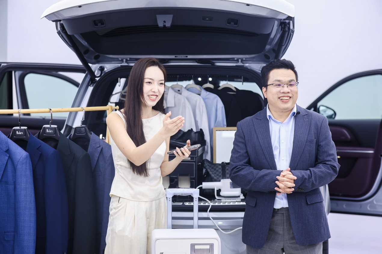作为大五座SUV,岚图泰山X8的超大空间能秒变超大衣帽间。通过专属挂衣杆、魔术挂钩等,后备厢被划分为上衣区、下装区与配饰区,形成分层分区、井然有序的收纳空间。直播中,主播从大衣到配饰的取用流畅无阻,迅速且持续地完成换装动作。