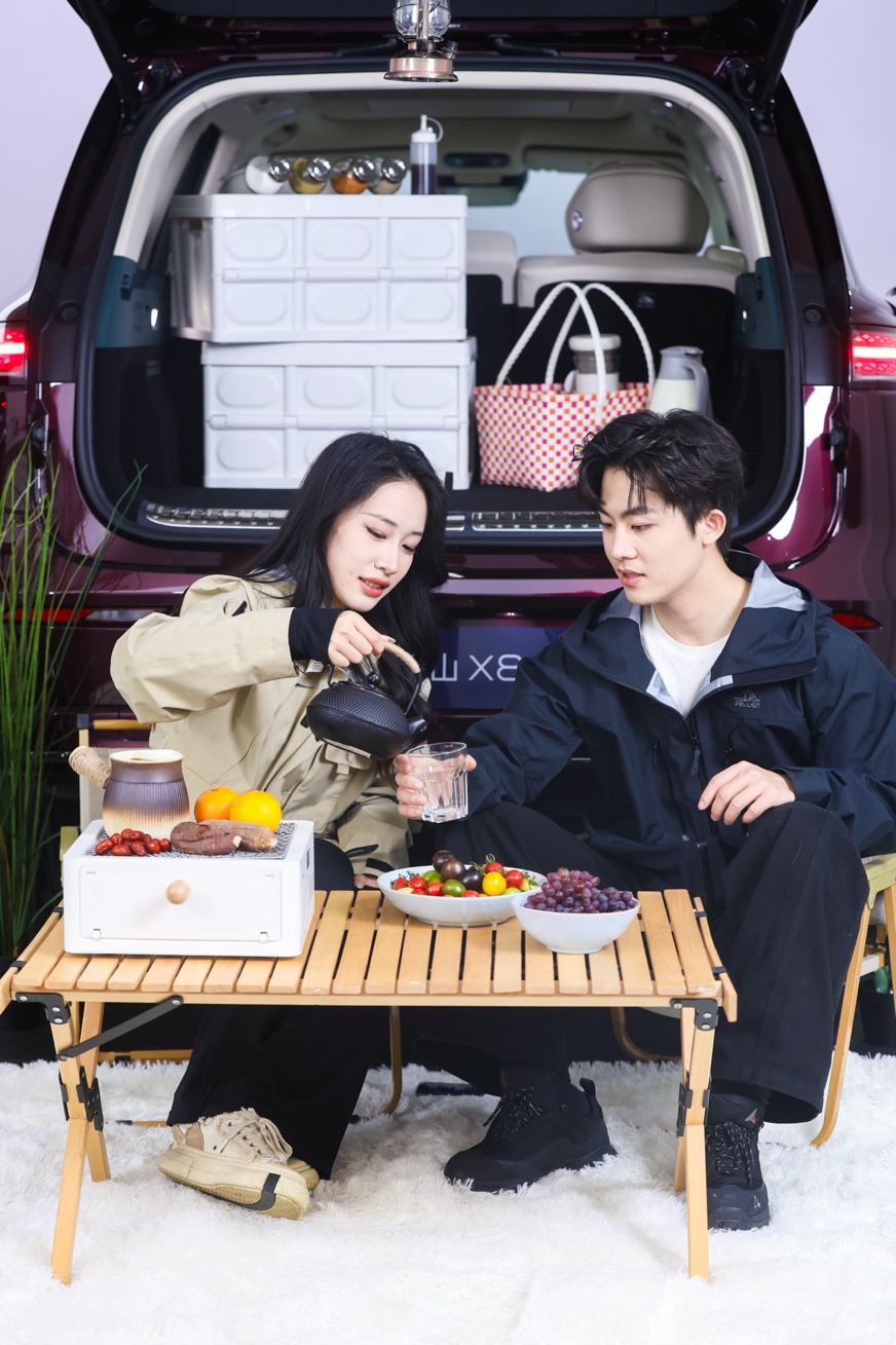 直播间还展示了露营房,泰山X8的13升双开门冰箱全程冷链运输,后备箱220V插座用于熨烫机、电脑、音响、手机等设备取电,6kW外放电可以直接接电磁炉。户外露营,肉串、饮料、水果,泰山X8全都安排得明明白白,整个露营摊搬进车里不在话下。