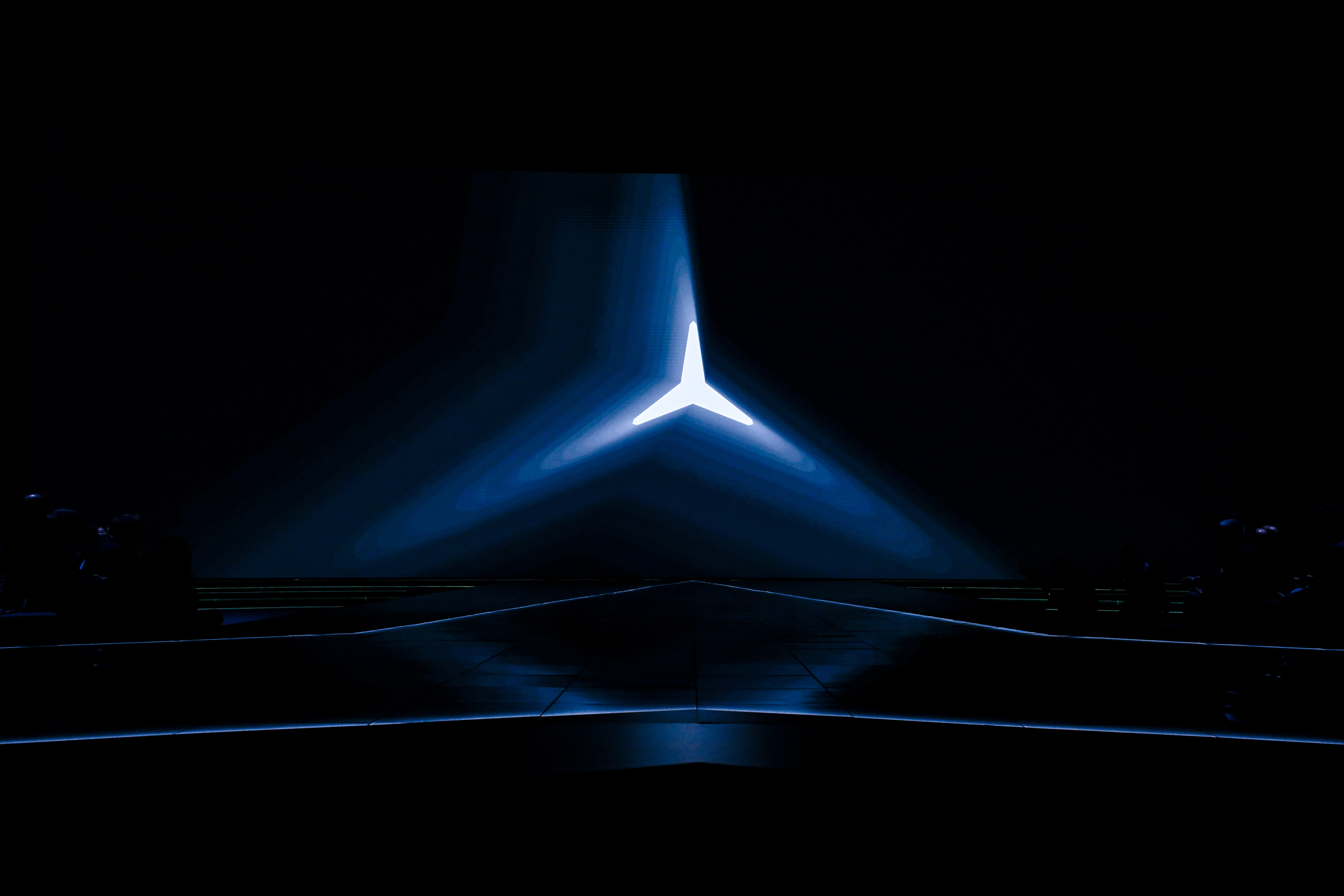 核心的首秀舞台,以三叉星徽为灵感打造,没有复杂的装饰,却自带高级感。灯光亮起的瞬间,星徽轮廓在空间中缓缓舒展,140年的创新脉络顺着舞台铺展开来——从早期机械时代的精密打磨,到安全领域的突破性革新,再到如今电动化、智能化的全面发力,每一段历程都清晰可感。