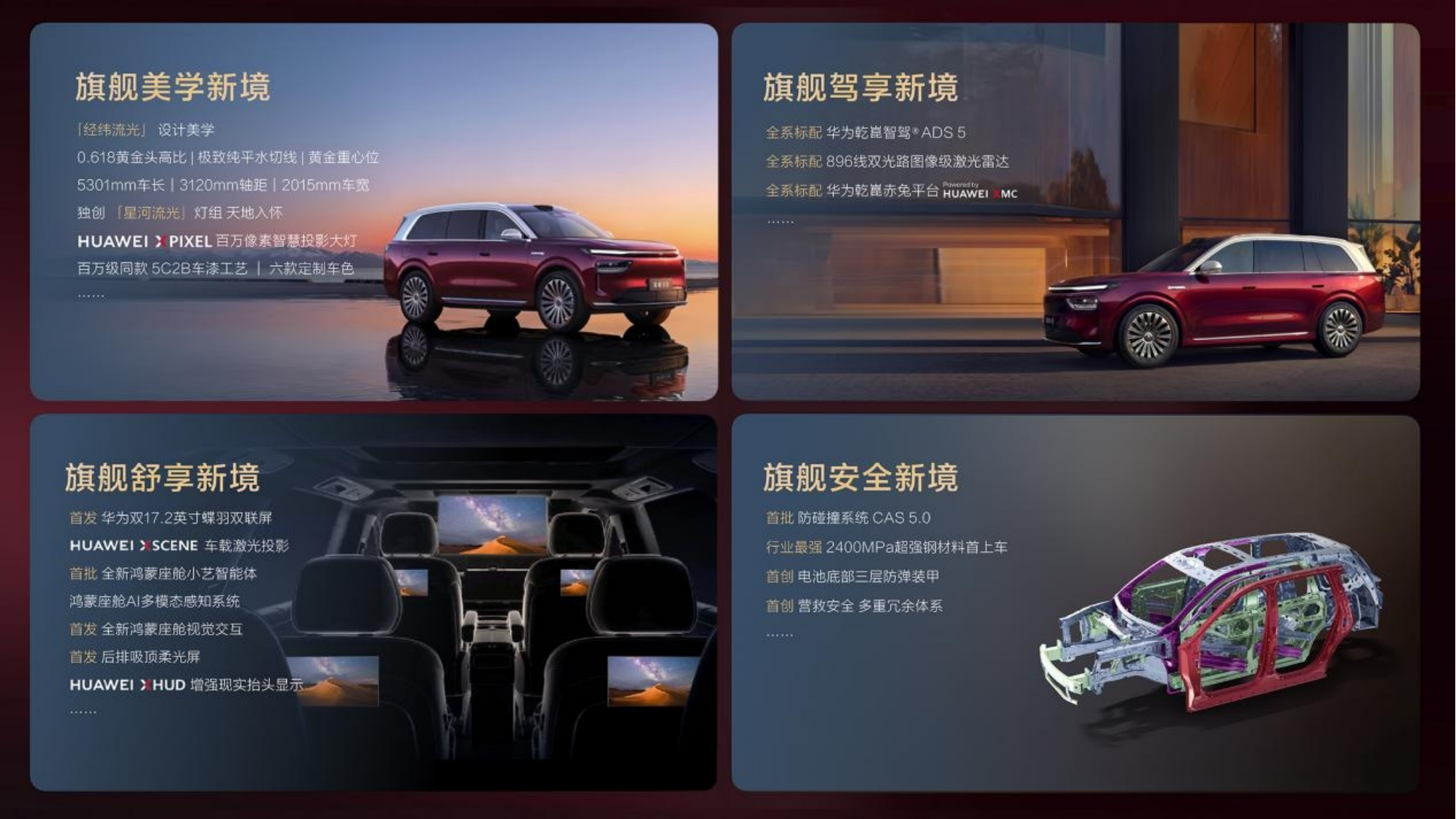 作为华为本届技术大会的重点主推车型,奕境X9定位高端家庭旗舰六座SUV,车身尺寸达到5301mm×2015mm,轴距3120mm,全系原生标配华为乾崑最新一代智驾、座舱、安全全栈技术,堪称华为技术实力的集大成者。