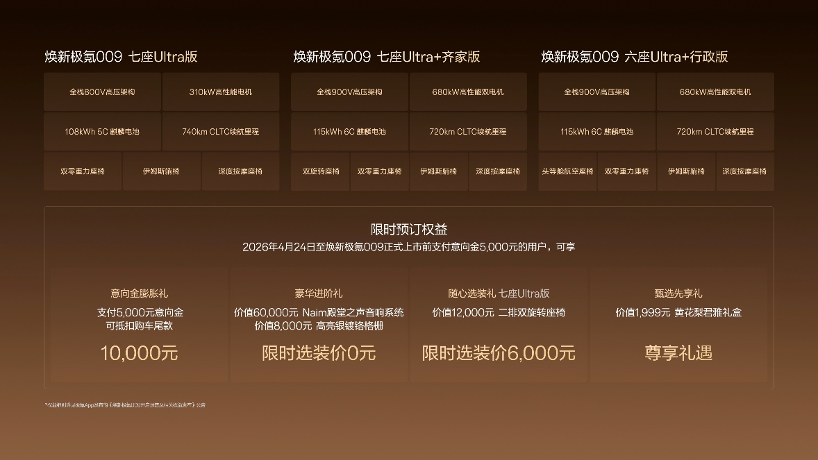 据悉,新车共推出七座 Ultra版、七座 Ultra+齐家版和六座 Ultra+行政版。限时预订权益至高享8万元:1. 预付5000元意向金,尾款可抵扣10000元;2. 预售期免费选装价值60000元Naim殿堂之声音响系统、8000元高亮银镀铬格栅;3. 七座Ultra版用户,预售限时特惠价6000元选装原价12000元的二排双旋转座椅;4.价值1999元极氪专属的黄花梨君雅礼盒。