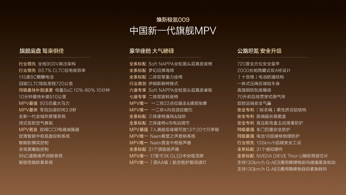 在产品力上,焕新极氪009从豪华、性能、安全三大维度实现了全面跃升。