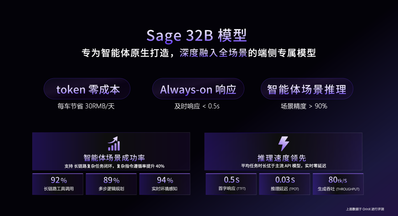 在响应速度上,Sage 端侧大模型实现 Always-on 全天候待命,指令整体延迟低于 0.5 秒,单次推理延迟仅 0.03 秒,生成吞吐达80 token/秒。不同于云端模型易受网络波动影响,该模型常驻本地算力单元,无需联网与云端调度,隧道、车库等弱网环境也能即时反馈。