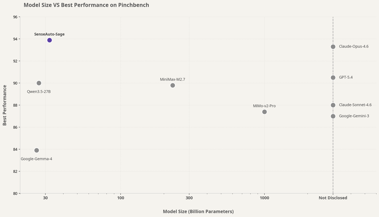 Sage 采用 32B 总参的 MoE 架构,激活参数仅 3B,是行业首款能在车端实现复杂智能体能力的基座大模型。在国际公开评测 PinchBench 中,其最佳任务完成率达 94%,超越 Claude、GPT、Gemini 等一众云端大模型,打破“只有大模型才能做好智能体任务”的惯性认知。对比小米 MiMo-v2-Pro,Sage 激活算力仅为其1/14,显存占用约1/31,却实现了6.6个百分点的任务完成率领先,展现出端侧原生路线的极致高效。目前该模型已在英伟达 Orin X 平台完成部署,为量产落地奠定基础。