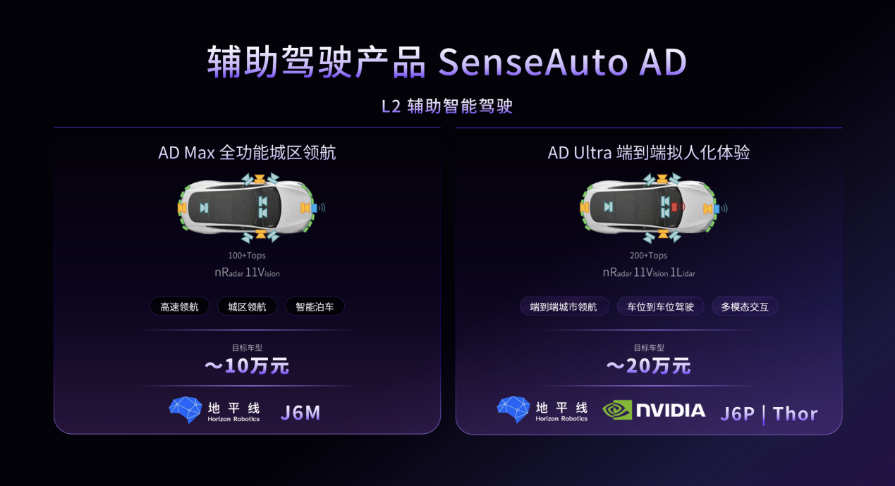 该方案作为统一智能底座,可无缝适配L2辅助驾驶至L4自动驾驶,还能快速部署于 J6P、J6M、英伟达 Thor 等多芯片平台,兼容性极强。商汤绝影推出 SenseAuto AD 两大 L2 智能驾驶方案。AD Max 面向10万级车型,搭载地平线 J6M 芯片,以11视觉+雷达配置实现高速 / 城区领航;AD Ultra 面向 20万级车型,增加激光雷达,依托高阶算力提供端到端拟人化体验,覆盖不同价位市场。