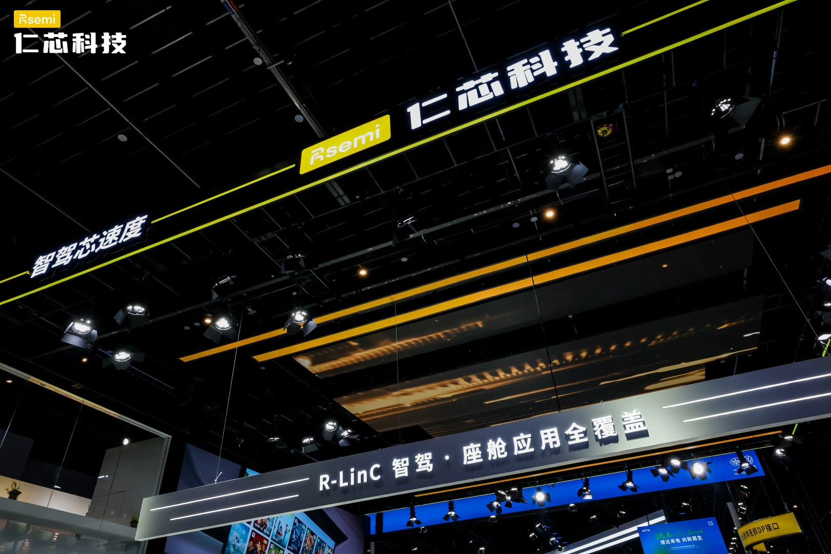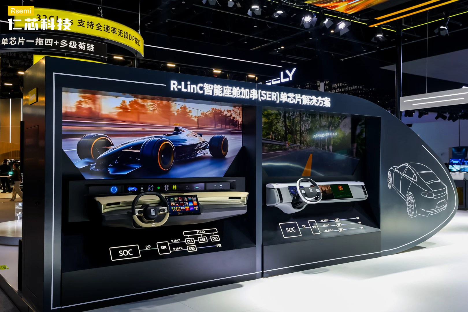在此次展会上,仁芯科技全方位展示了面向智驾与座舱的 R-LinC 方案矩阵,涵盖智能座舱组网、舱驾融合、行泊一体以及长距离传输等多个领域。