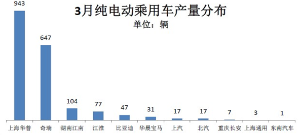 2014年3月,全国生产新能源乘用车2484辆,各个车企产量明显提升。其中,纯电动车仍是主流,3月生产1894辆,占76.24%。上海华普生产的康迪电动车产量居首,达943辆。