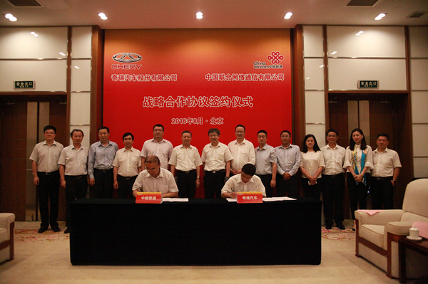 2016年8月9日,奇瑞汽车与中国联通在北京签署了双方的全面战略合作协议,明确了双方资源共享、创新发展的战略合作思路,也将双方集团层面的深入跨界合作推上了一个新的高度。