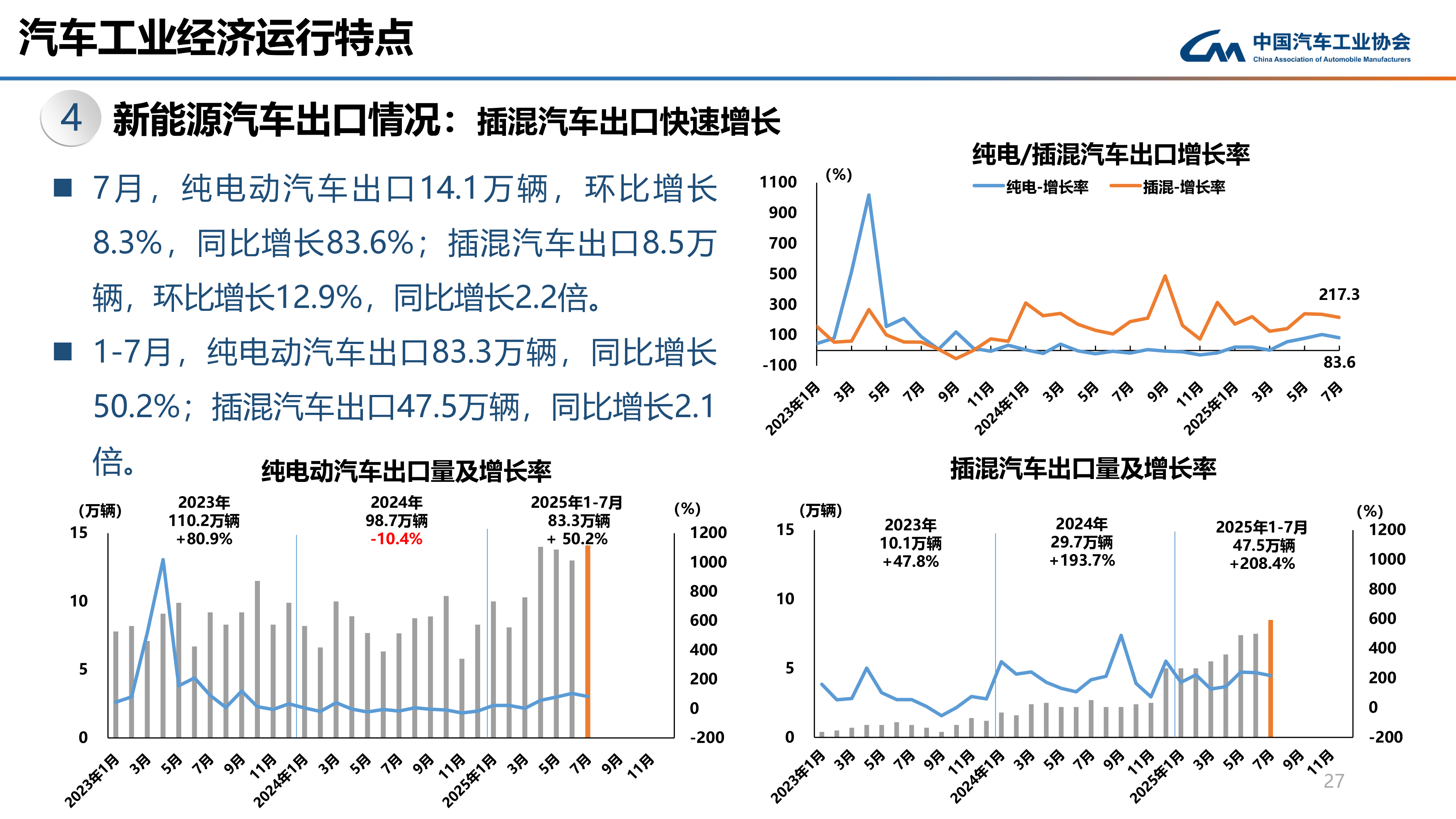 其中,2025年1-7月纯电动汽车出口83.3万辆,同比增长50.2%;插混汽车出口47.5万辆,同比增长2.1倍。