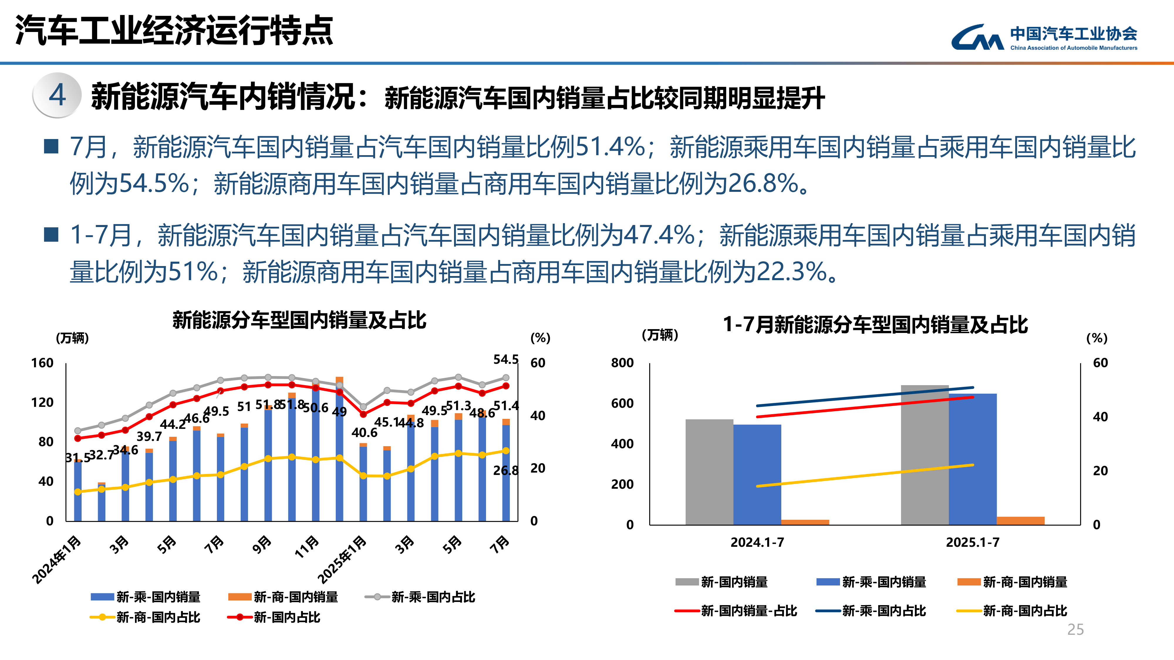 而2025年7月,我国新能源汽车国内销量103.7万辆,环比下降7.8%,同比增长16.9%。其中,新能源乘用车国内销量97.5万辆,环比下降7.5%,同比增长14.4%;新能源商用车国内销量6.2万辆,环比下降12.1%,同比增长77.8%。新能源汽车国内销量占汽车国内销量比例51.4%;新能源乘用车国内销量占乘用车国内销量比例为54.5%;新能源商用车国内销量占商用车国内销量比例为26.8%。