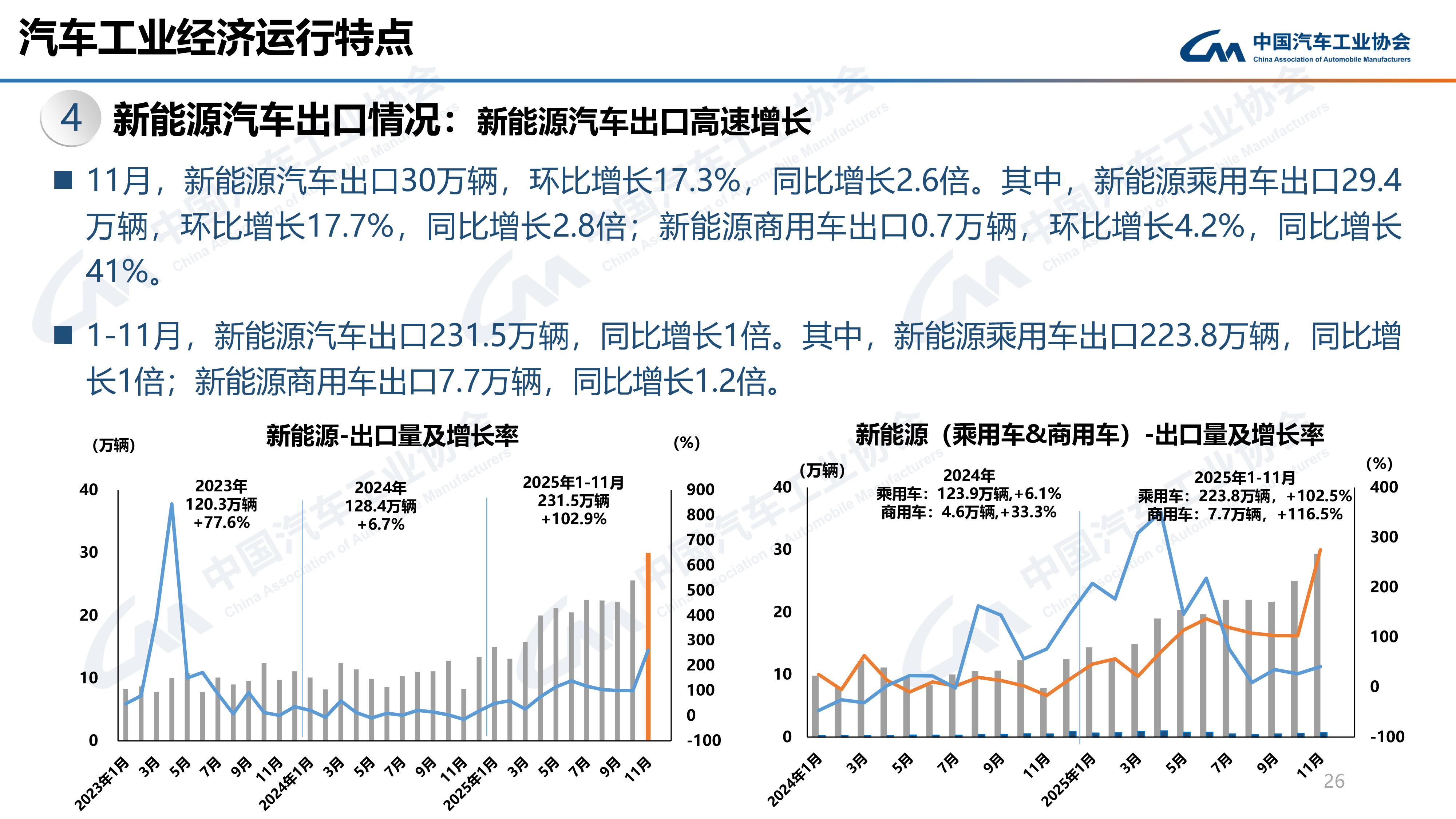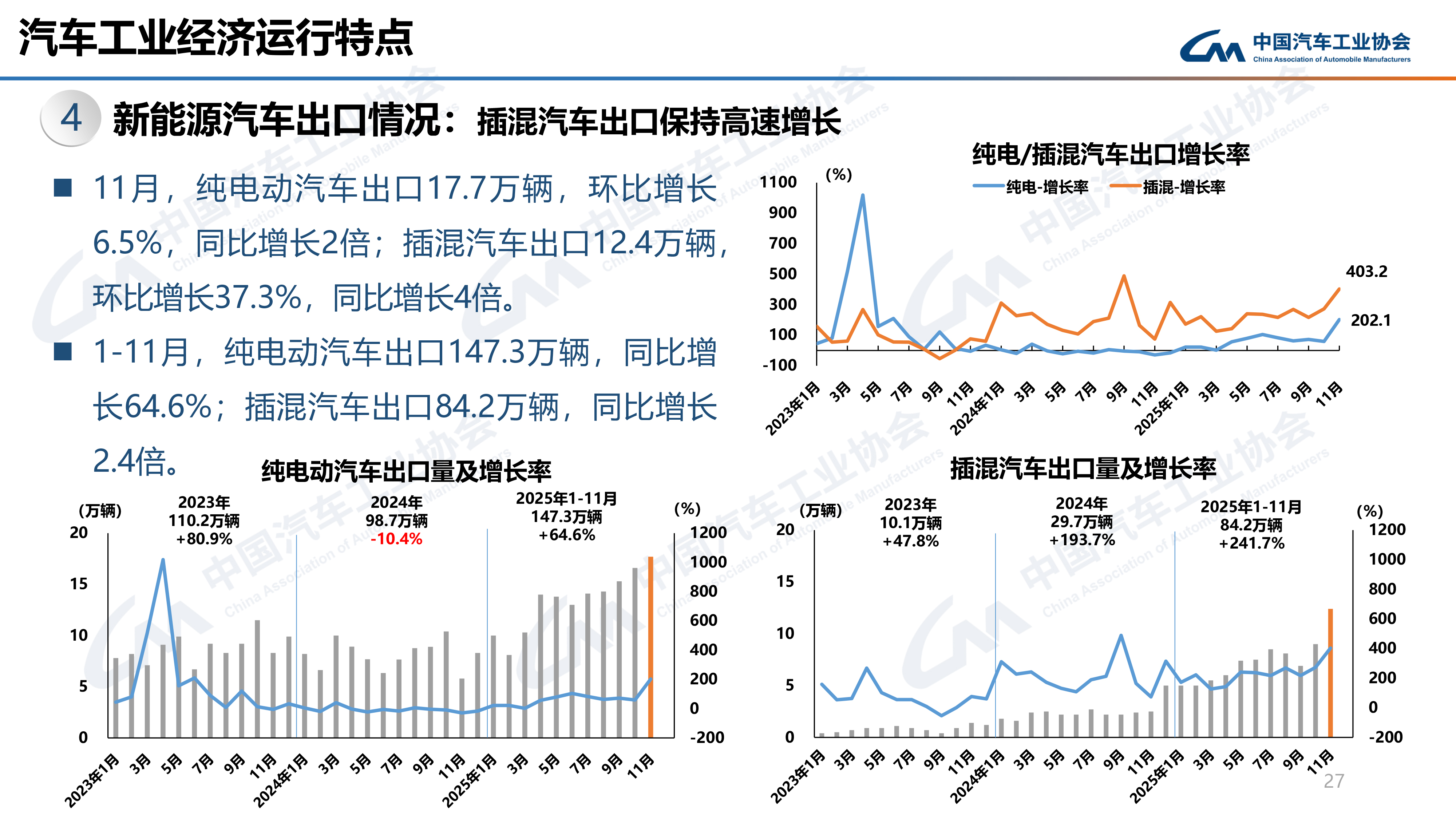 其中,2025年1-11月我国纯电动汽车出口147.3万辆,同比增长64.6%;插混汽车出口84.2万辆,同比增长2.4倍。