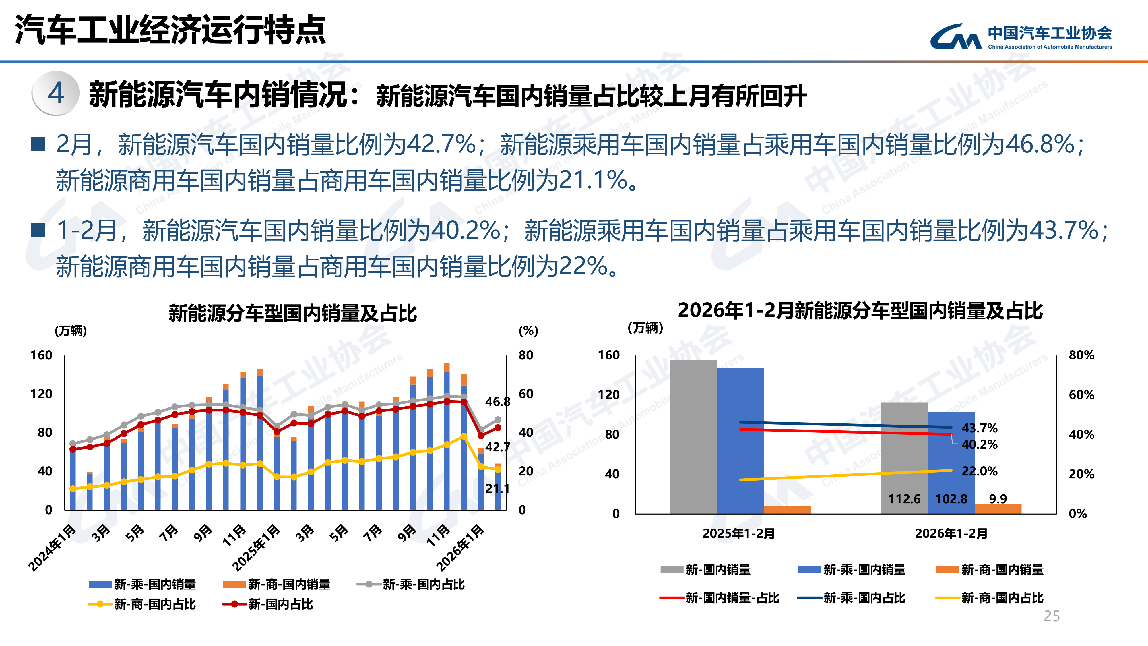 而2026年1-2月,我国新能源汽车国内销量112.6万辆,同比下降27.5%。其中,新能源乘用车国内销量102.8万辆,同比下降30.3%;新能源商用车国内销量9.9万辆,同比增长25.3%。而新能源汽车国内销量比例为40.2%;新能源乘用车国内销量占乘用车国内销量比例为43.7%;新能源商用车国内销量占商用车国内销量比例为22%。
