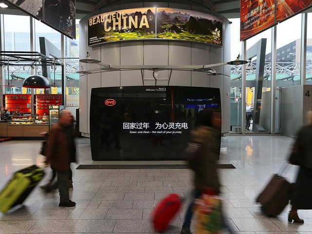 今年春节前,在英国伦敦希思罗机场、德国法兰克福机场、法国巴黎戴高乐机场的大屏幕上,都能见到比亚迪的身影。品牌视频后出现的“回家过年,为心灵充电”这句标语,既体现出比亚迪“新能源汽车引领者”的特色,更引